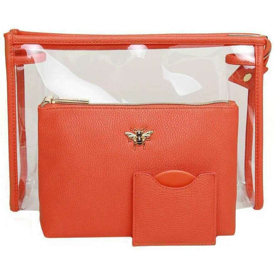 Brought to you by the brand Alice Wheeler London, this orange women's 3 piece beauty set is made from 100% vegan faux leather. It measures clear case: 21cm(height) x 30cm(width) x 8cm(depth) beauty case: 13.5cm(height) x 20cm(width) x 6cm(depth) compact: 7.4cm(height) x 8.2cm(width). It is recommended to wipe clean with damp cloth to keep this bag in good condition. All the bags come complete in alice wheeler london packaging. The Alice Wheeler London 3 Piece Beauty Set - Orange will make a superb addition to your collection, giving you 2 storage cases and a handy compact mirror. The clear case is perfect for travelling while the stylish make-up bag will look elegant on your dresser and will keep all of your beauty products in one place. Both the make-up bag and compact are embellished with the beautifully iconic Honeybee. This set is perfect as a gift idea.