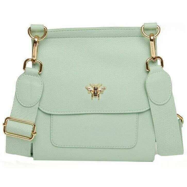 Designer Alice Wheeler London has brought you this women's 100% vegan faux leather bag using pastel mint tones. It measures 18cm(height) x 20cm(width) x 12cm(depth). All the bags come complete in alice wheeler london packaging. The Alice Wheeler London Bloomsbury Crossbody Bag - Pastel Mint will make a stunning and stylish everyday bag or will accessorise your evening outfit when at a more formal event. Fitted with an adjustable cross body strap you can find a length that best suits you for comfortable carrying. The Bloomsbury offers a good-sized main section and is secured with a flap and magnetic clasp closure. The iconic and elegant Bumble Bee logo rounds off this gorgeous design as well as named branding on the back.