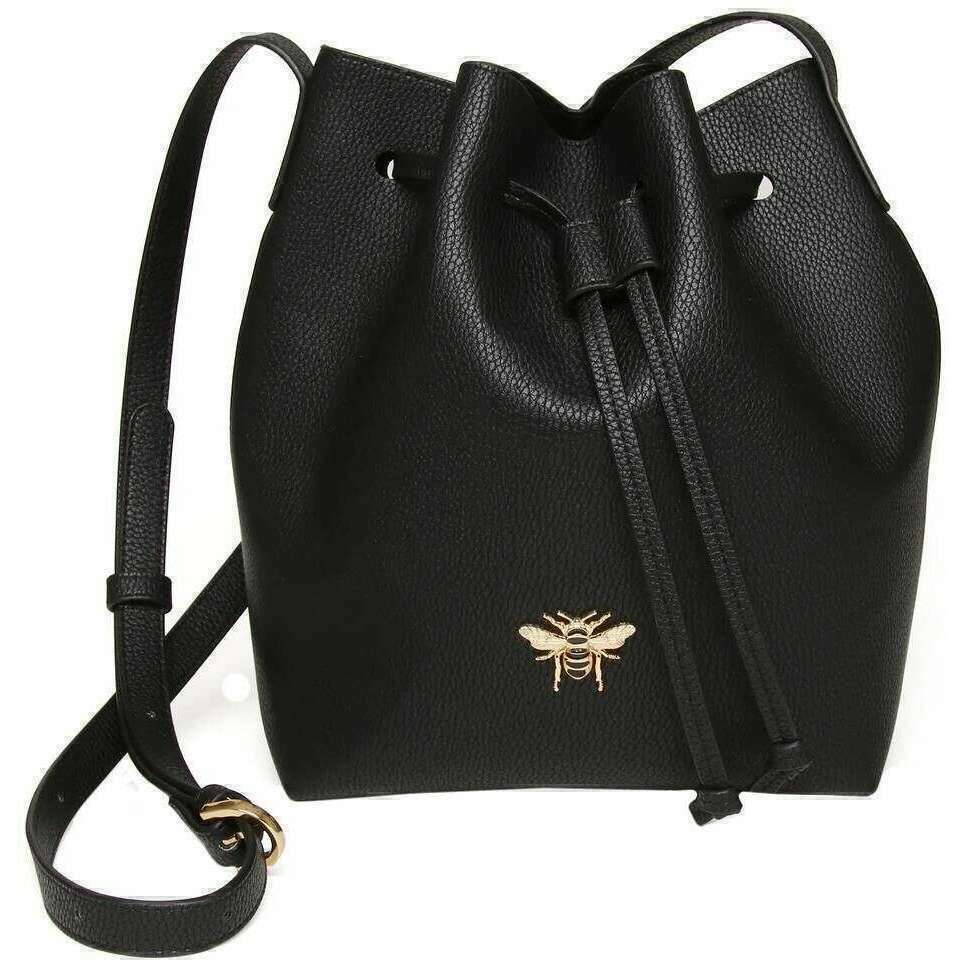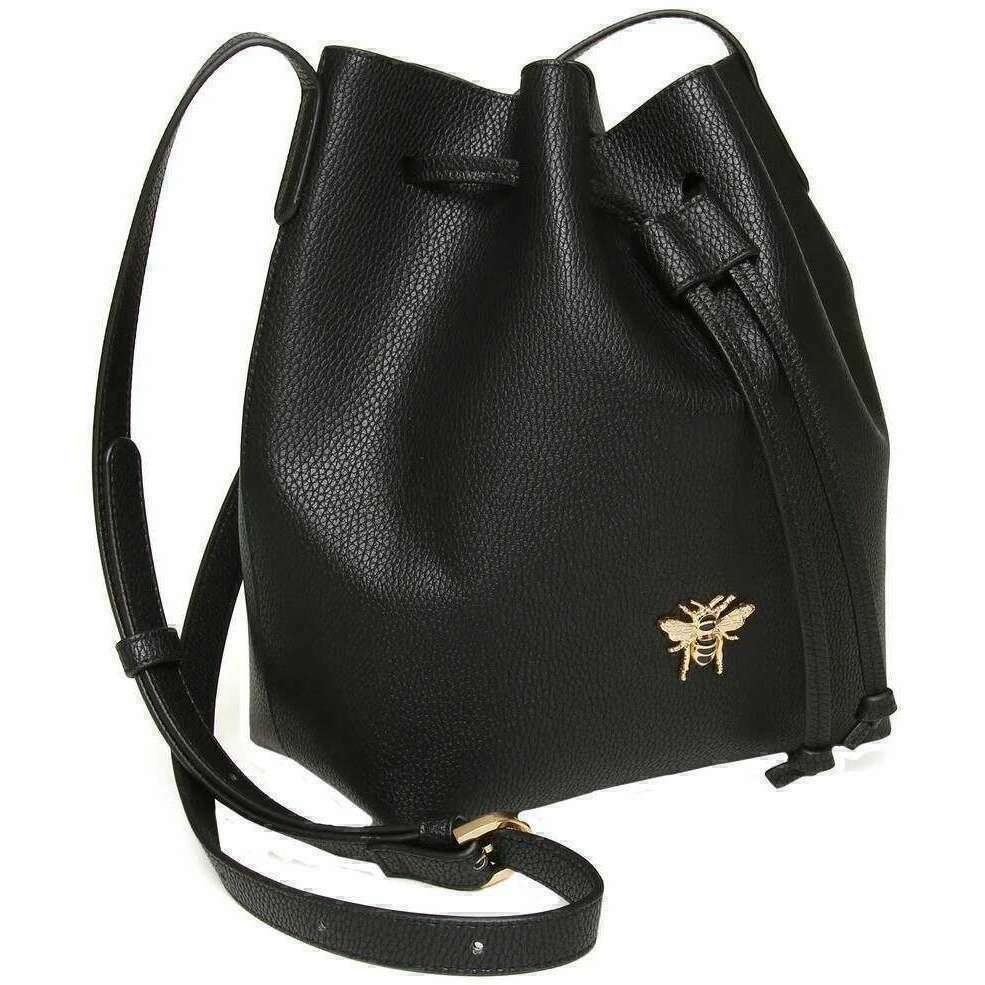 Perfect for women is this Alice Wheeler London black bucket crossbody bag, it is also made from 100% vegan faux leather. It measures 26cm(height) x 20cm(width) x 12.5cm(depth). All the bags come complete with alice wheeler packaging. The Alice Wheeler London Bucket Crossbody Bag - Black crafted from high-quality vegan leather is a must-have if you are looking for a casual bag that is sleek and elegant that will keep you looking smart and sophisticated. Featuring a toggle closure to securely fasten the bag for security, a belt buckle designed adjustable shoulder strap for versatility and a spacious main compartment for optimal storage. These features make this the perfect everyday bag for your essentials. Complete with the signature honeybee logo adorned to the front.