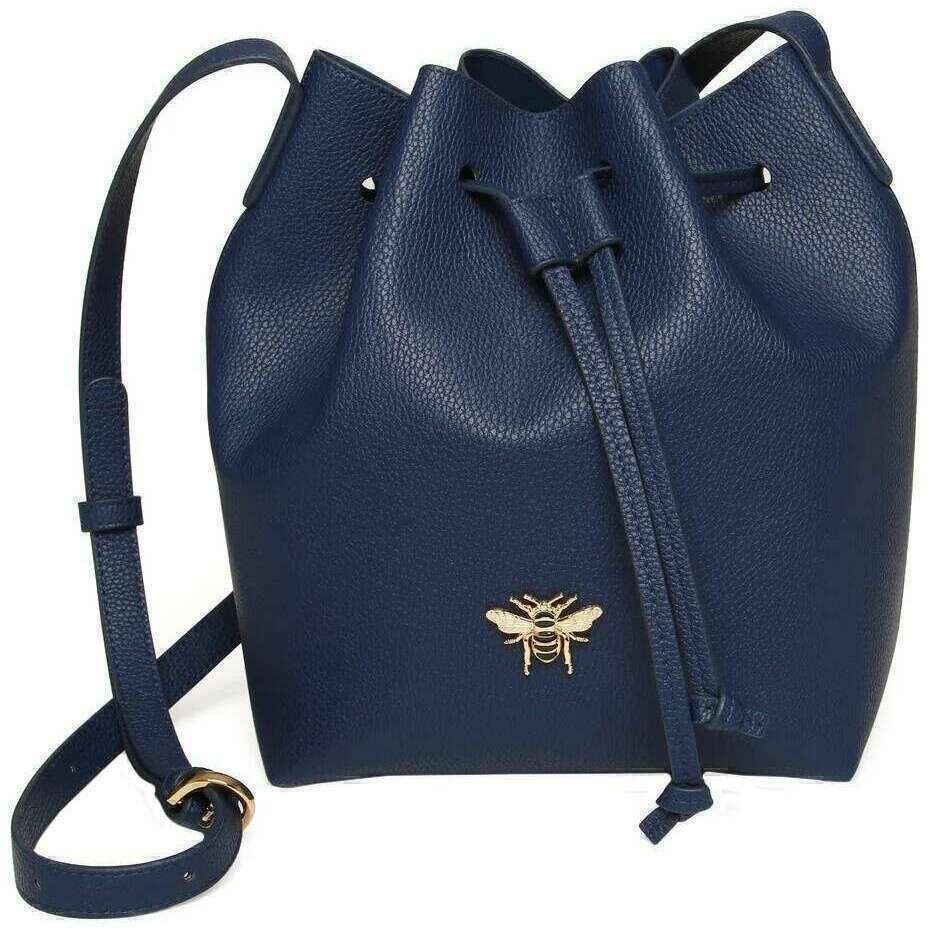 Manufactured from 100% vegan faux leather is this navy women's bucket crossbody bag by the designer Alice Wheeler London. It measures 26cm(height) x 20cm(width) x 12.5cm(depth). All the bags come complete with alice wheeler packaging. The Alice Wheeler London Bucket Crossbody Bag - Navy crafted from high-quality vegan leather is a must-have if you are looking for a casual bag that is sleek and elegant that will keep you looking smart and sophisticated. Featuring a toggle closure to securely fasten the bag for security, a belt buckle designed adjustable shoulder strap for versatility and a spacious main compartment for optimal storage. These features make this the perfect everyday bag for your essentials. Complete with the signature honeybee logo adorned to the front.