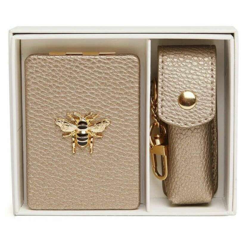 ({IF["Brought to you by the brand Alice Wheeler London, this bronze women's oblong compact mirror and lipstick holder gift set is made from 100% vegan faux leather. It measures mirror - 8.5cm(height) x 6cm(width) lipstick holder - 8.5cm(height) x 3cm(width) x 3cm(depth). All the compacts come complete with alice wheeler packaging. The Alice Wheeler London Oblong Compact Mirror and Lipstick Holder Gift Set - Bronze will make a stunning gift to yourself or someone you love. The beautifully iconic bee embellishment is featured on the mirror, and both have matching colours and hardware, making them a stylish matching pair. The mirror is great for everyday touch ups, and the lipstick holder is perfect for protecting your favourite everyday lipstick in style. These will be a perfect addition to your everyday bag, adding convenience."!=""]})