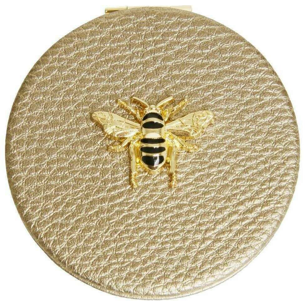This women's round compact mirror has been made from 100% vegan faux leather, featured in a bronze colour and is from the brand Alice Wheeler London. It measures 7cm(height) x 7cm(width). It is recommended to wipe clean with damp cloth to keep this compact in good condition. All the compacts come complete in alice wheeler london packaging. The Alice Wheeler London Round Compact Mirror - Bronze is the perfect accessory that is essential to carry around with you in your handbag. The beautifully iconic bee embellishment adorns the front of it. Inside is a 7x magnifying mirror with a twin gold-toned metal frame which is ideal for those day to day touch ups.
