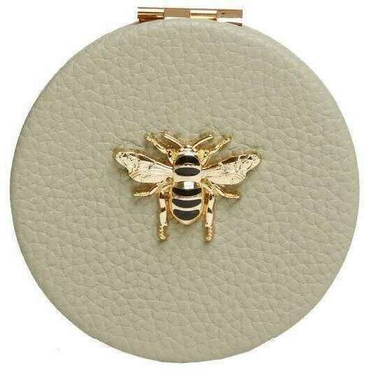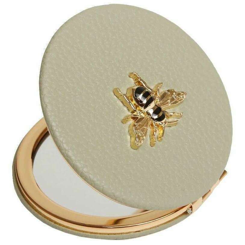 Designer Alice Wheeler London has brought you this women's 100% vegan faux leather compact using pistachio green tones. It measures 7cm(height) x 7cm(width). It is recommended to wipe clean with damp cloth to keep this compact in good condition. All the compacts come complete in alice wheeler london packaging. The Alice Wheeler London Round Compact Mirror - Pistachio Green is the perfect accessory that is essential to carry around with you in your handbag. The beautifully iconic bee embellishment adorns the front of it. Inside is a 7x magnifying mirror with a twin gold-toned metal frame which is ideal for those day to day touch ups.