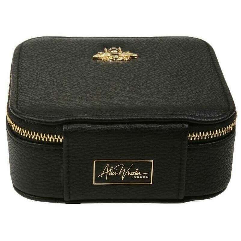 Manufactured from vegan faux leather and faux suede interior is this black women's travel jewellery box by the designer Alice Wheeler London. It measures 13.5cm(height) x 13.5cm(width) x 5cm(depth). All the jewellery boxes come complete with alice wheeler packaging. The Alice Wheeler London Travel Jewellery Box - Black will become an all-time favourite with its great organisation and perfect size to slip into any bag whatever the occasion. Featuring a ring roll great for earrings and your most worn rings, 3 small compartments for smaller pieces, 2 larger side compartments for necklaces and bracelets and a mirror on the lid. The gold-toned zipper closure offers security and luxury. Complete with the signature honeybee logo adorned to the top of this case.