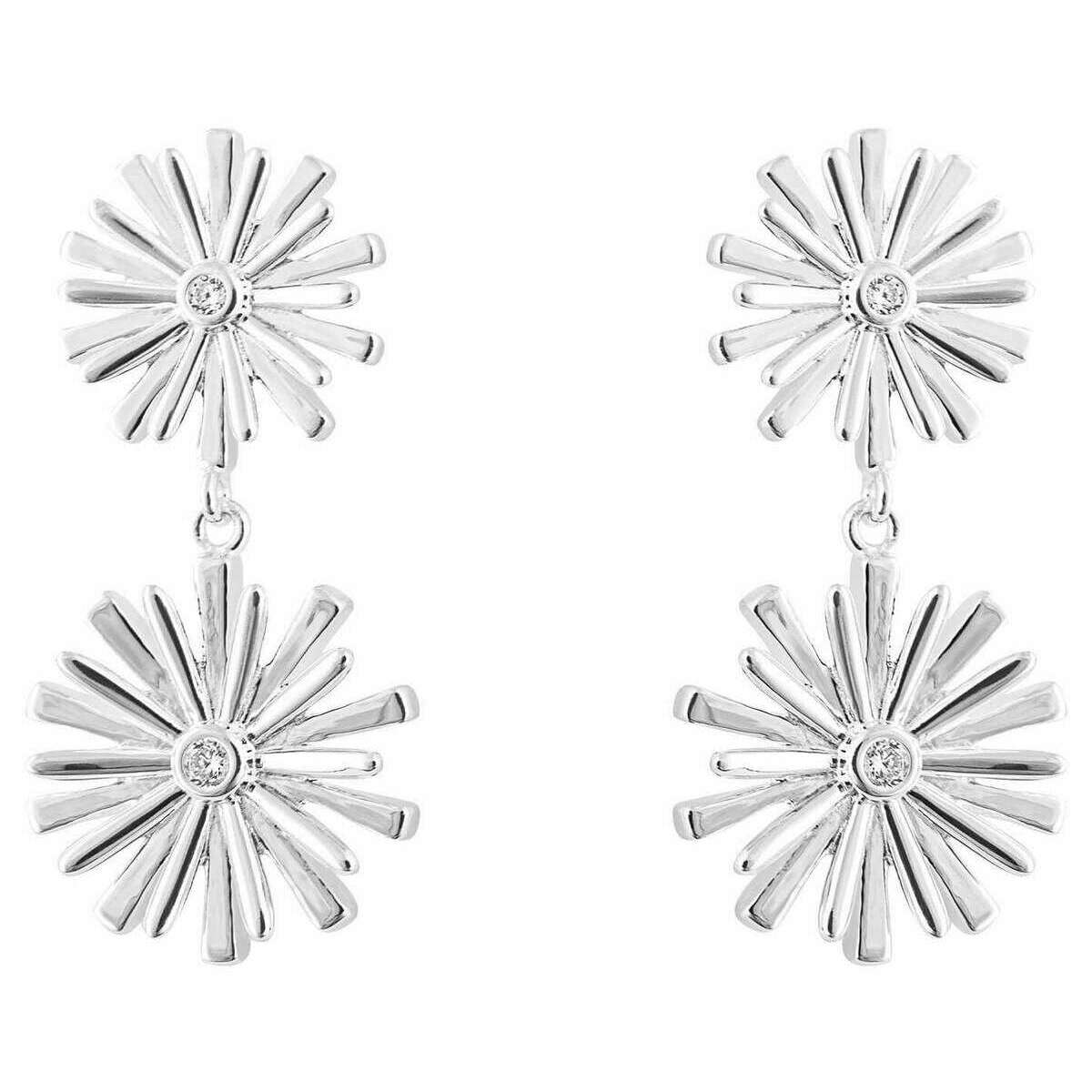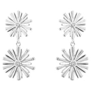 Manufactured from 100% recycled sterling silver and clear synthetic gemstone are these silver women's stylised double flower gemstone drop earrings by the designer Beginnings. It measures 2.5cm(height) x 1.2cm(width) x 0.2cm(depth). All the earrings come complete with beginnings packaging. The Beginnings Stylised Double Flower Gemstone Drop Earrings - Silver resembles the natural beauty of flowers combined with the unique appearance of geometric shapes. Featuring cubic zirconia stones in the centre of each flower gives this piece is sparkle and girly feel. This is the perfect day to night pair and will match lovely with all of your outfits. Made with recycled skin safe sterling silver ensures a high-quality and luxurious wear.