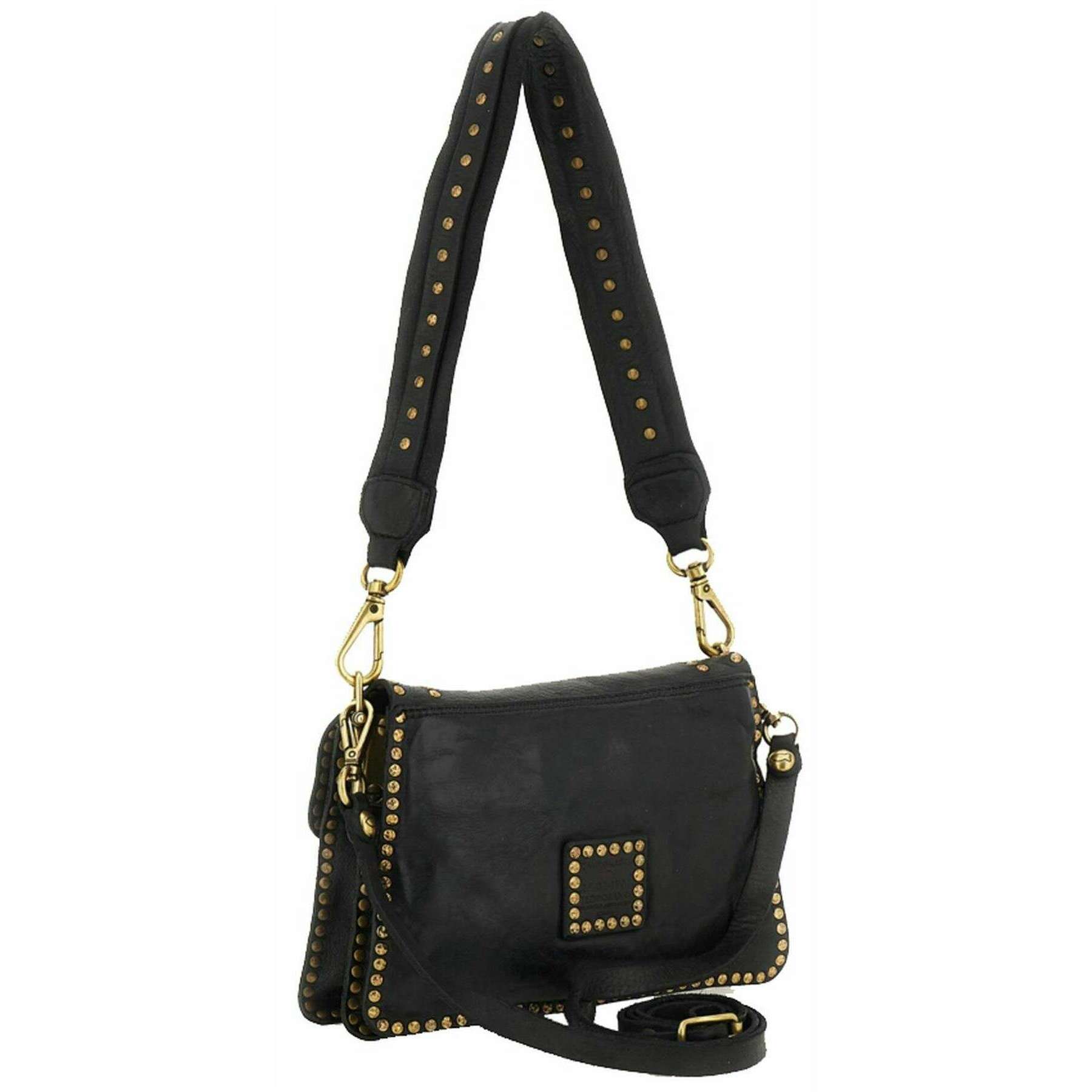 This well made women's agnese stud crossbody bag from Campomaggi comes in a black colour and is manufactured from 100% cowhide leather. It measures 15cm(height) x 22cm(width) x 4cm(depth). Campomaggi have made this agnese stud crossbody bag in Italy. It is recommended to brush with a damp cloth and avoid using detergents to keep this bag in good condition. All the bags come complete with campomaggi packaging. The Campomaggi Agnese Stud Crossbody Bag - Black offers ample storage with three spacious compartments and internal pockets to keep all your essentials organised. The swivel clasp and flap over closure ensures security whilst the studs adorned all over gives a luxurious finish. Crafted from premium leather, it features a beautiful vintage-inspired colour achieved through vegetable tanning which a traditional process that uses natural ingredients for a rich finish. For added convenience and versatility is an added adjustable detachable crossbody strap for an everyday look.