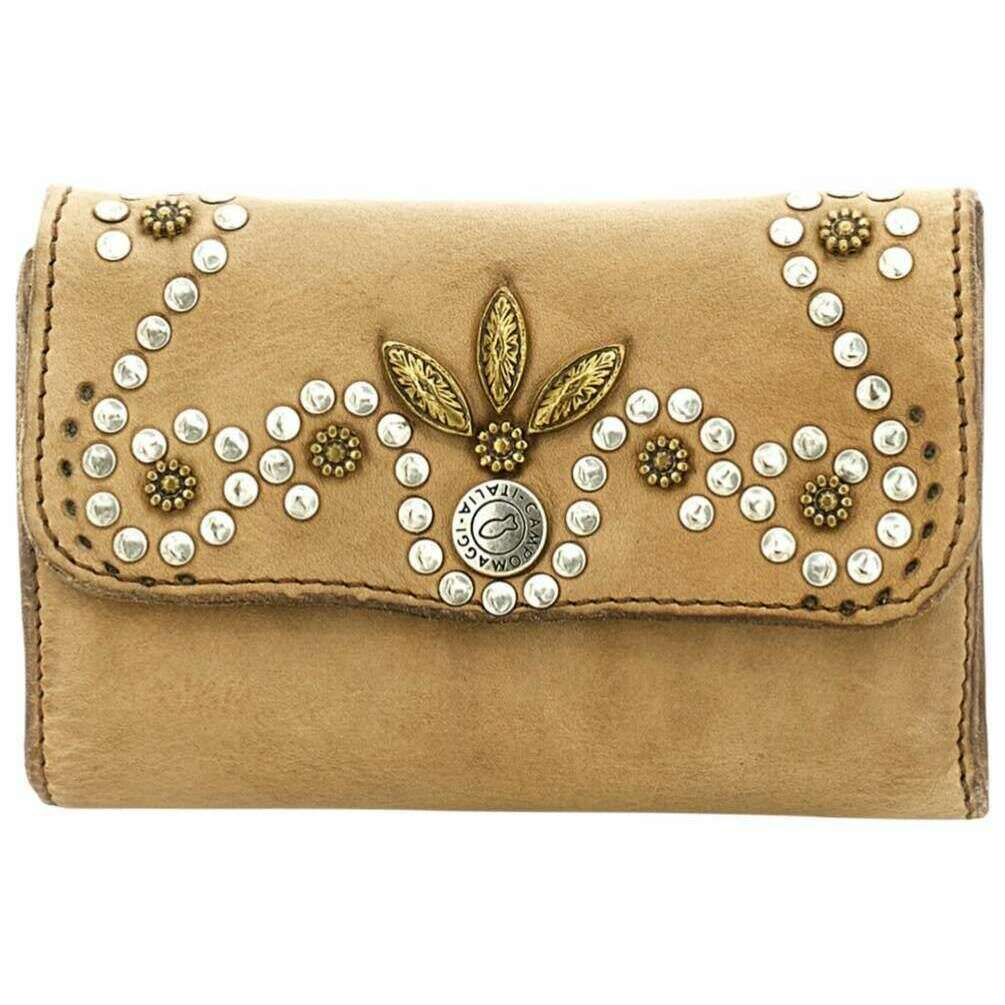 This well made women's mirta siena flap over purse from Campomaggi comes in a ice beige colour and is manufactured from 100% vegtable tanned cowhide leather. It measures 14cm(height) x 10cm(width) x 1.5cm(depth). Campomaggi have made this mirta siena flap over purse in Italy. All the purses come complete with campomaggi packaging. The Campomaggi Mirta Siena Flap Over Purse - Ice Beige is a refined accessory that showcases the brand s distinctive Italian craftsmanship. Made from premium vegetable?tanned cowhide leather, it develops a rich patina over time, reflecting the natural beauty and durability of the material. The front is adorned with an elegant stud design, adding a subtle decorative touch that enhances its classic silhouette. Secured with a press stud closure, the purse opens to reveal a thoughtfully organised interior featuring three compartments and ten card holders ideal for keeping cards, cash, receipts, and essentials neatly arranged. Despite its structured layout, the design remains slim and easy to carry, making it perfect for everyday use. Handmade in Italy, the Campomaggi Mirta Siena Flap Over Purse blends functionality, artisanal detail, and timeless style, making it a sophisticated addition to any accessories collection.