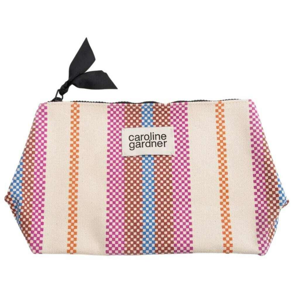 Caroline Gardner Check Stripe Canvas Beauty Bag - White/Pink/Orange