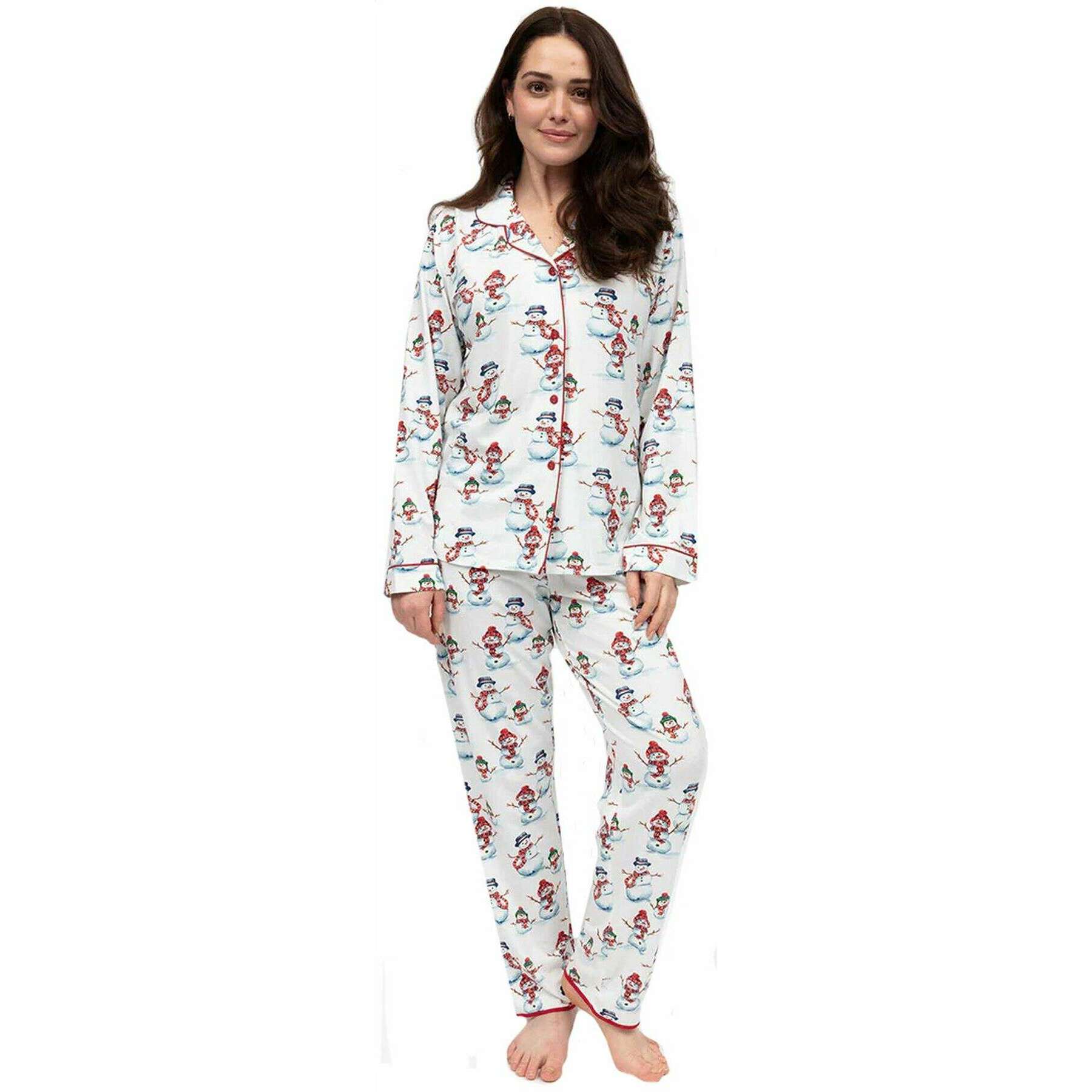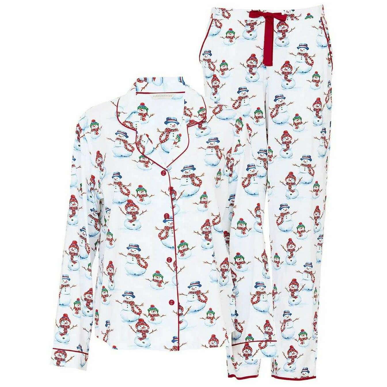 These women's blaze snowman printed pyjama set by the brand Cyberjammies are made from 52% cotton, 41% modal and 7% elastane and are showcased in red. Also the white/red pyjamas are designed in a unique pattern, It is recommended to machine wash inside out, do not soak, wash with like colours to keep these pyjamas in good condition. All the pyjamas come complete with cyberjammies tags. The Cyberjammies Blaze Snowman Printed Pyjama Set - White/Red ensures you can celebrate the festive season in comfort. Made from a soft cotton-modal-elastane blend, this set features a cheerful snowman print on a winter white base, trimmed with bright red piping for a polished finish. The top includes a revere collar, cuffed sleeves, and covered buttons, while the bottoms offer an elasticated back, flat front, adjustable drawstring, and side pockets. Perfect for cosy nights, family photos, or simply adding a touch of festive cheer to your lounging.