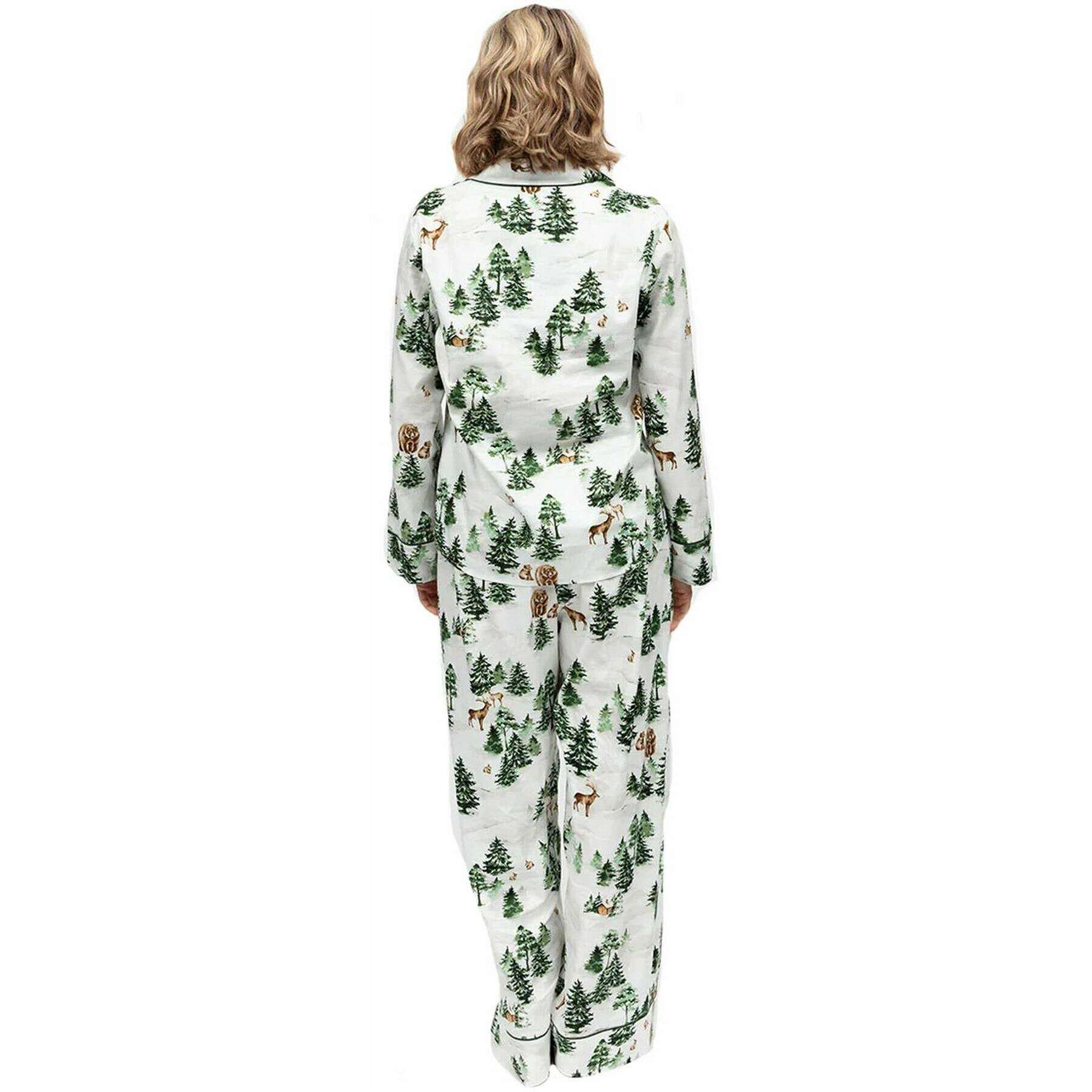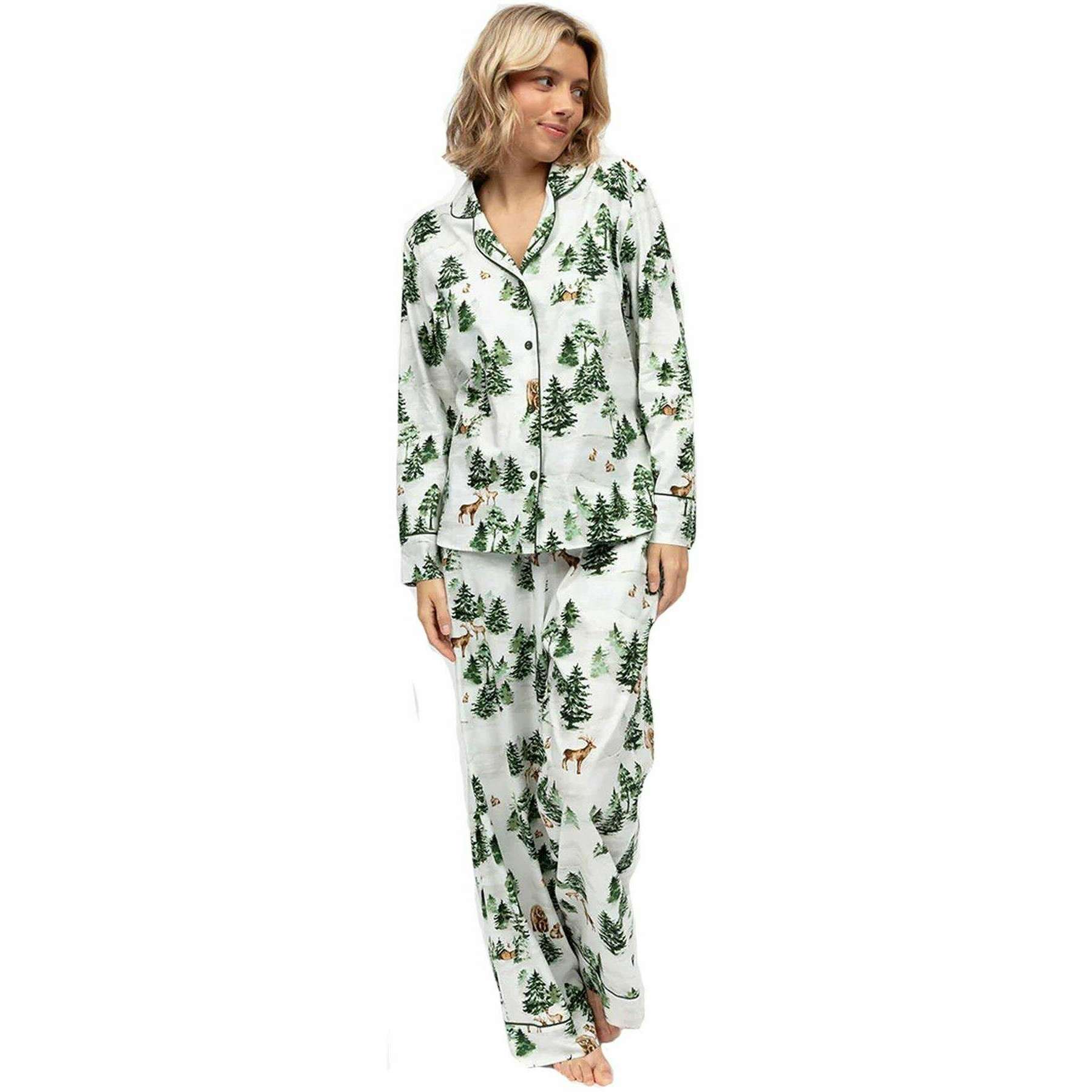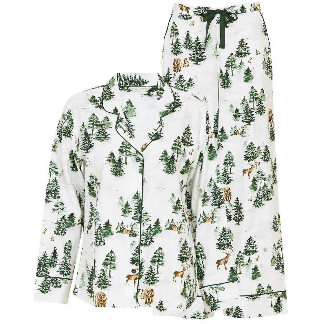 These women's fern alpine print jersey pyjama set by the brand Cyberjammies are made from 60% cotton and 40% modal and are showcased in green. Also the olive green/white pyjamas are designed in a floral pattern, It is recommended to machine wash inside out, do not soak, wash with like colours to keep these pyjamas in good condition. All the pyjamas come complete with cyberjammies tags. The Cyberjammies Fern Alpine Print Jersey Pyjama Set - Olive Green/White bring cosy winter vibes to your downtime. Made from a soft cotton-modal blend, this set features a serene alpine print of pine trees, cabins, and woodland animals on a crisp white background. The top includes a revere collar, olive green piping, and covered buttons for a tailored finish, while the wide-leg bottoms offer an elasticated back, flat front, adjustable drawstring, and side pockets for comfort and ease. Perfect for festive mornings or relaxed evenings, this set combines seasonal charm with everyday luxury.