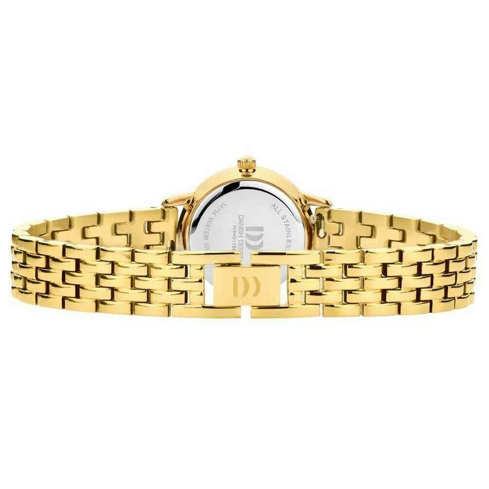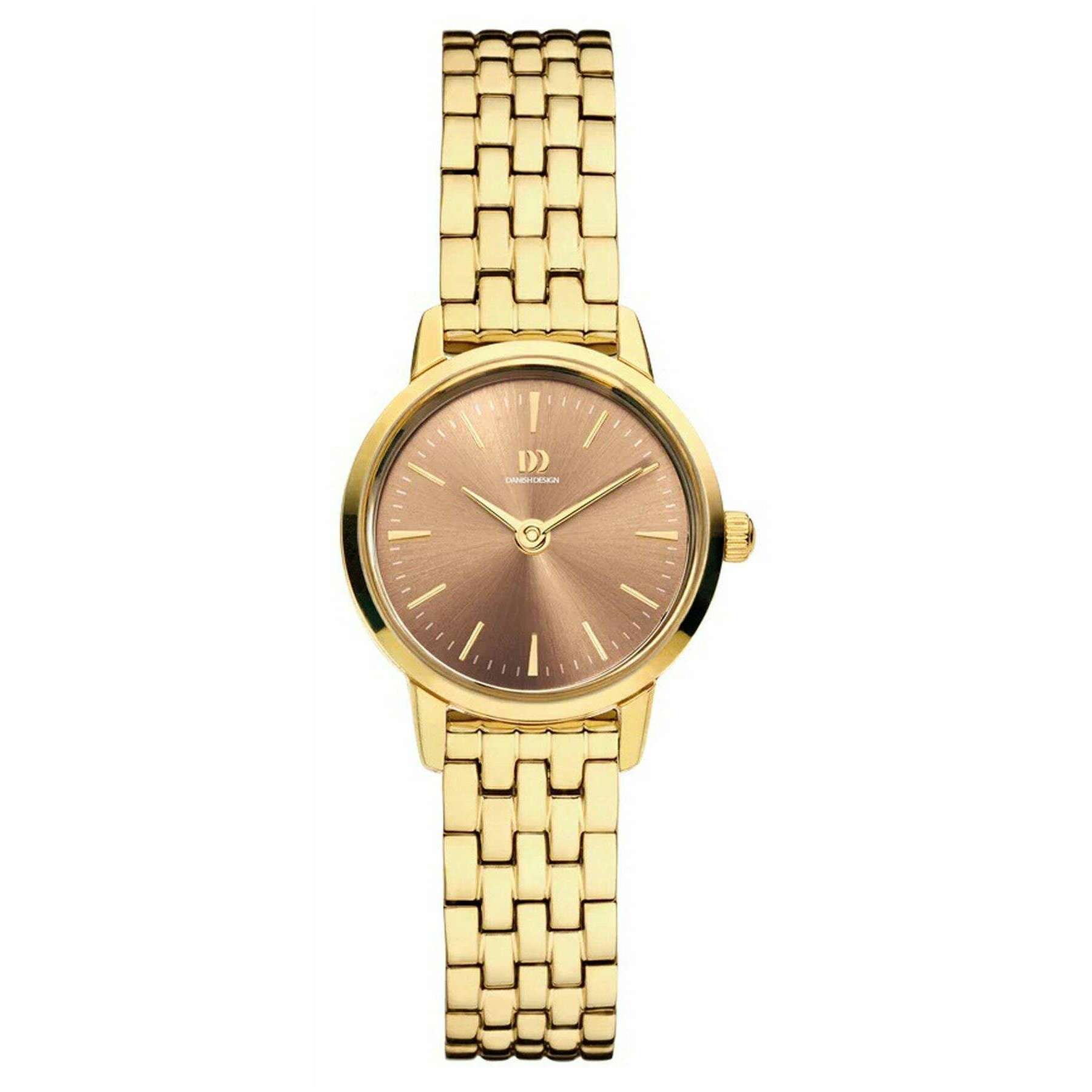 This women's akilia mini link watch has been made from stainless steel, featured in a gold colour and is from the brand Danish Design. It measures 2.2cm(case diameter). All the watches come complete with danish design packaging. The Danish Design Akilia Mini Link Watch - Gold/Hazel Brown is a petite and stylish design that will add a touch of shine and elegance to any attire. Featuring a polished metal casing, this stunning watch displays a bright dial with shiny gold hands and a brown dial face and is securely fastened with a push clasp. It also features a quartz movement, water-resistant up to 3 ATM and a refined link bracelet, creating a timeless piece that balances subtle elegance with a contemporary edge.