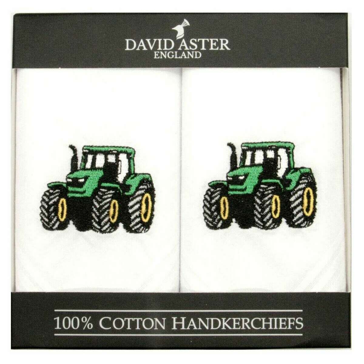 Introducing this men's tractor embroidered handkerchiefs by David Aster, it is manufactured from 100% cotton in a white colour. 2 pack handkerchiefs are value for money ensuring they are a good buy, All the handkerchiefs come complete with a david aster presentation box. The David Aster Tractor Embroidered Handkerchiefs - White is a stunning pack to own with it featuring green tractors on a white background. Certain to impress, this will be guaranteed to give your attire the perfect finishing trendy look due to its personalised design making you stand out from the crowd. Make this a great gift to any country gentleman.