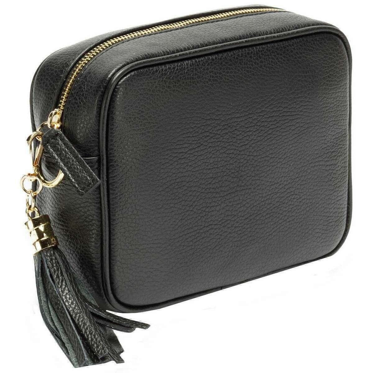 Manufactured from 100% genuine premium leather is this black women's crossbody bag by the designer Elie Beaumont. It measures 15cm(height) x 20cm(width) x 7cm(depth). All the bags come complete with elie beaumont packaging. The Elie Beaumont Crossbody Bag - Black trendy and versatile is a must-have to add to your collection with the gorgeous and useful features. The detachable body strap can be adjusted to your liking depending on the outfit and the look you are going for perfect for all occasions. The large main compartment and interior pocket is great for optimal storage and organisation to hold everything and more that you need. The double layer reinforced base and double stitched side seams ensure this bag is durable and long-lasting. Crafted from premium grained genuine leather is complete with gold hardware and a matching detachable tassel for a girly touch.