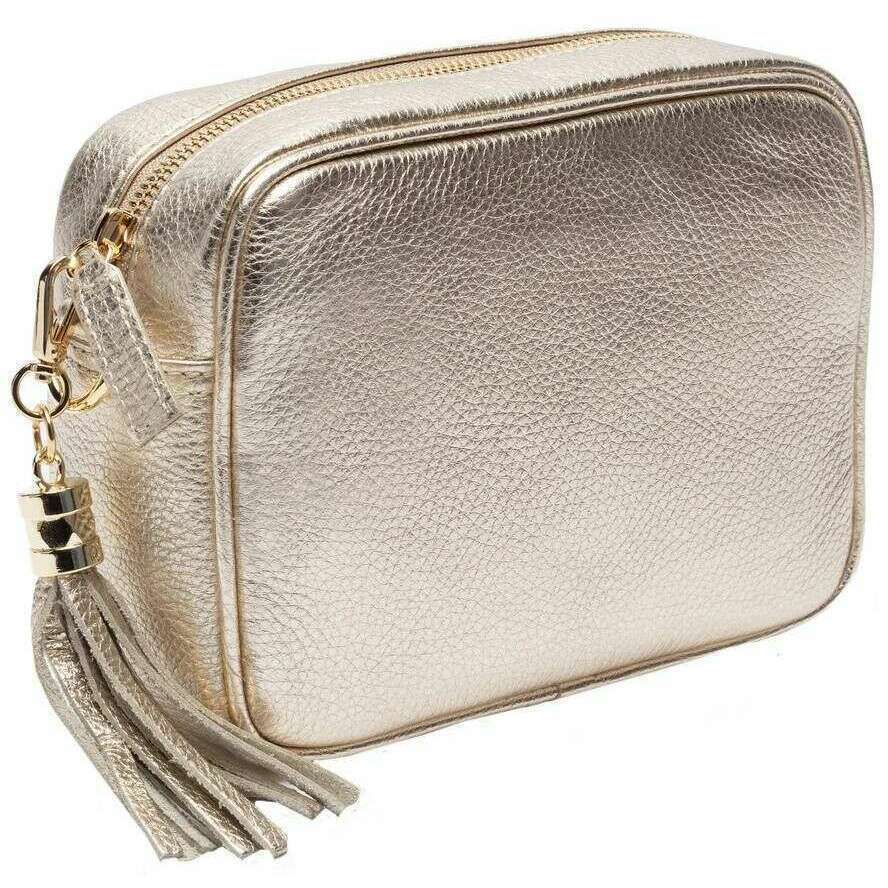 Brought to you by the brand Elie Beaumont, this gold women's crossbody bag is made from 100% genuine premium leather. It measures 15cm(height) x 20cm(width) x 7cm(depth). All the bags come complete with elie beaumont packaging. The Elie Beaumont Crossbody Bag - Gold trendy and versatile is a must-have to add to your collection with the gorgeous and useful features. The detachable body strap can be adjusted to your liking depending on the outfit and the look you are going for perfect for all occasions. The large main compartment and interior pocket is great for optimal storage and organisation to hold everything and more that you need. The double layer reinforced base and double stitched side seams ensure this bag is durable and long-lasting. Crafted from premium grained genuine leather is complete with gold hardware and a matching detachable tassel for a girly touch.