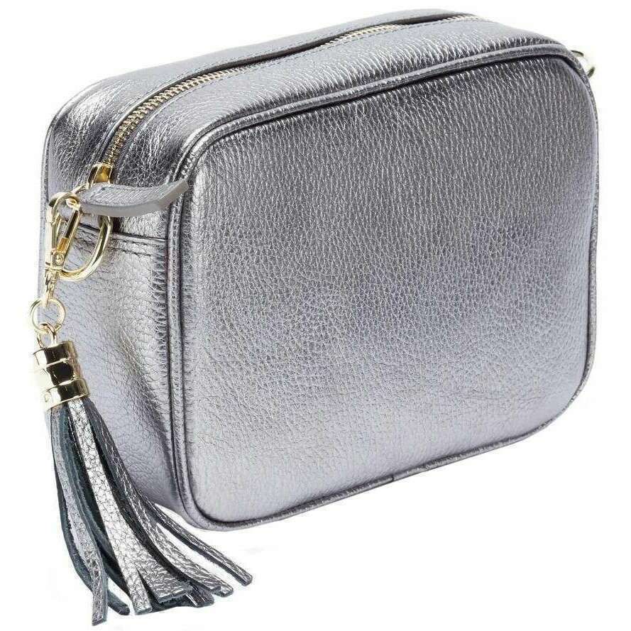 Using silver 100% genuine premium leather, this crossbody bag by Elie Beaumont is perfect for women and a must have. It measures 15cm(height) x 20cm(width) x 7cm(depth). All the bags come complete with elie beaumont packaging. The Elie Beaumont Crossbody Bag - Pewter Silver trendy and versatile is a must-have to add to your collection with the gorgeous and useful features. The detachable body strap can be adjusted to your liking depending on the outfit and the look you are going for perfect for all occasions. The large main compartment and interior pocket is great for optimal storage and organisation to hold everything and more that you need. The double layer reinforced base and double stitched side seams ensure this bag is durable and long-lasting. Crafted from premium grained genuine leather is complete with gold hardware and a matching detachable tassel for a girly touch.
