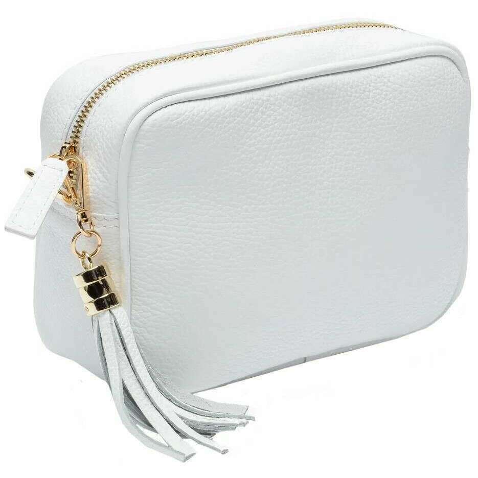 This women's crossbody bag has been made from 100% genuine premium leather, featured in a white colour and is from the brand Elie Beaumont. It measures 15cm(height) x 20cm(width) x 7cm(depth). All the bags come complete with elie beaumont packaging. The Elie Beaumont Crossbody Bag - White trendy and versatile is a must-have to add to your collection with the gorgeous and useful features. The detachable body strap can be adjusted to your liking depending on the outfit and the look you are going for perfect for all occasions. The large main compartment and interior pocket is great for optimal storage and organisation to hold everything and more that you need. The double layer reinforced base and double stitched side seams ensure this bag is durable and long-lasting. Crafted from premium grained genuine leather is complete with gold hardware and a matching detachable tassel for a girly touch.