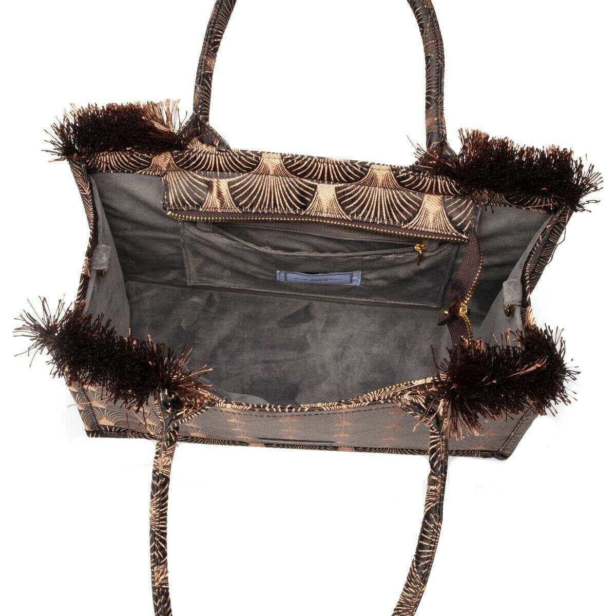 This women's fabric midi tote bag by the brand Elie Beaumont is made from 100% fabric and is showcased in black. Elie Beaumont have made this fabric midi tote bag in Italy. All the bags come complete with elie beaumont packaging. The Elie Beaumont Fabric Midi Tote Bag - Black Copper Fan elevates your everyday style as this gorgeous tote is designed for both style and functionality. Crafted from durable, high-quality fabric, this tote is perfect for daily errands, work essentials, or weekend outings. Its spacious main compartment is generously sized to hold books, groceries or your laptop with ease and the internal zipped pocket is ideal to keep your valuables secure and easily accessible. Carry comfortably with the dual carry straps and the tassel details add a touch of elegance.