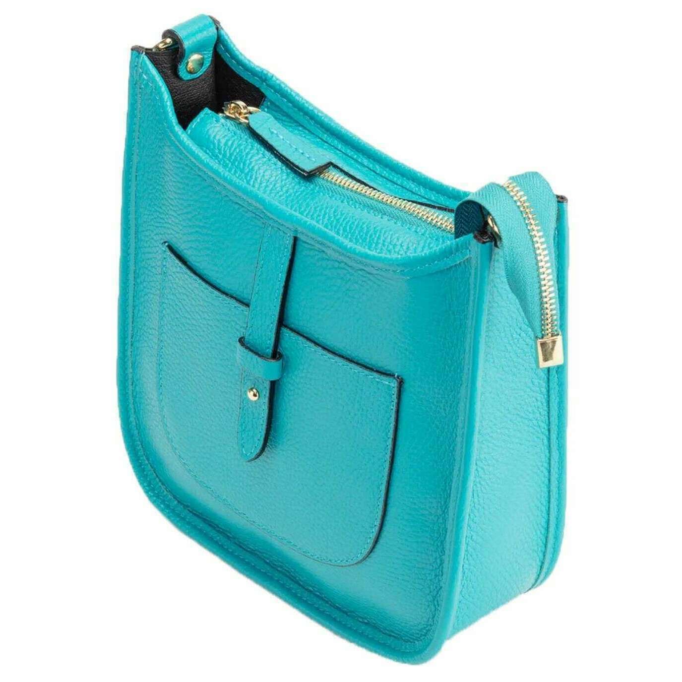 Perfect for women is this Elie Beaumont turquoise messenger bag, it is also made from 100% genuine premium leather. It measures 23cm(height) x 21.5cm(width) x 8cm(depth). All the bags come complete with elie beaumont packaging. The Elie Beaumont Messenger Bag - Turquoise crafted from genuine premium grained thick cut leather, is an all-round perfect bag for every woman. The gorgeous design allows this bag to be a smart and sophisticated everyday bag to a night bag with only the change of an outfit. Featuring an adjustable strap for versatile styling options, an internal zipper pocket and an external pocket for organisation. The subtle gold hardware gives a small detail for a luxurious look.