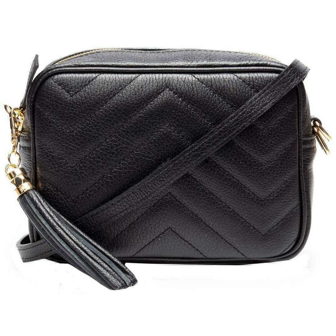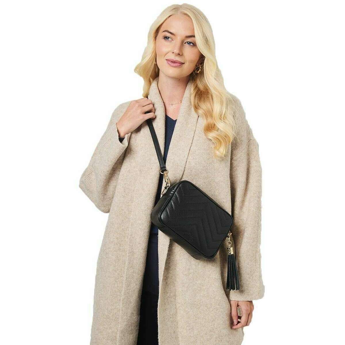 Perfect for women is this Elie Beaumont black quilted crossbody bag, it is also made from 100% genuine premium leather. It measures 12.5cm(height) x 12.5cm(width) x 8cm(depth). All the bags come complete with elie beaumont packaging. The Elie Beaumont Quilted Crossbody Bag - Black trendy and versatile is a must-have to add to your collection with the gorgeous and useful features. The detachable body strap can be adjusted to your liking depending on the outfit and the look you are going for perfect for all occasions. The large main compartment and interior pocket is great for optimal storage and organisation to hold everything and more that you need. The double layer reinforced base, quilting and double stitched side seams ensure this bag is durable and long-lasting. Crafted from premium grained genuine leather is complete with gold hardware and a matching detachable tassel for a girly touch.