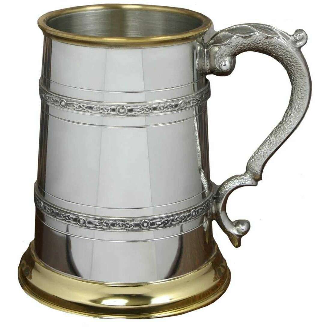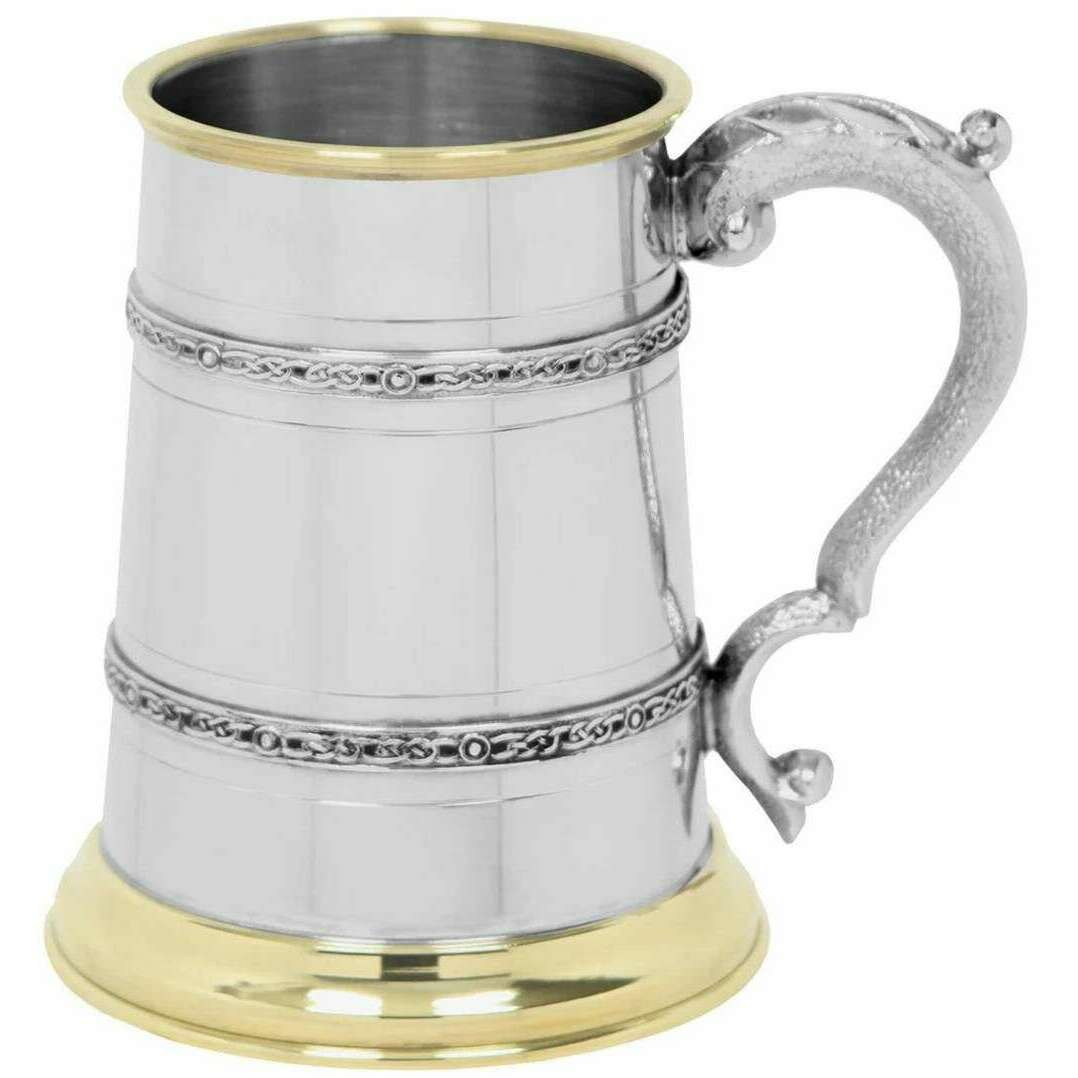 Manufactured from pewter and brass is this silver/gold unisex 1pt celtic tankard by the designer English Pewter Company. It measures 12.75cm(height). All the drinkware and glassware comes complete in a english pewter company gift box. The English Pewter Company 1pt Celtic Tankard - Silver/Gold is a simplistic piece with Celtic detailing, giving it all-round great appeal. Beautifully hand made to an exceptional quality with materials that will not tarnish over time, this tankard can be enjoyed on many occasions. This piece is the perfect way to honour traditions so whether you give it as a gift or enjoy it for yourself it needs to be added to your collection.