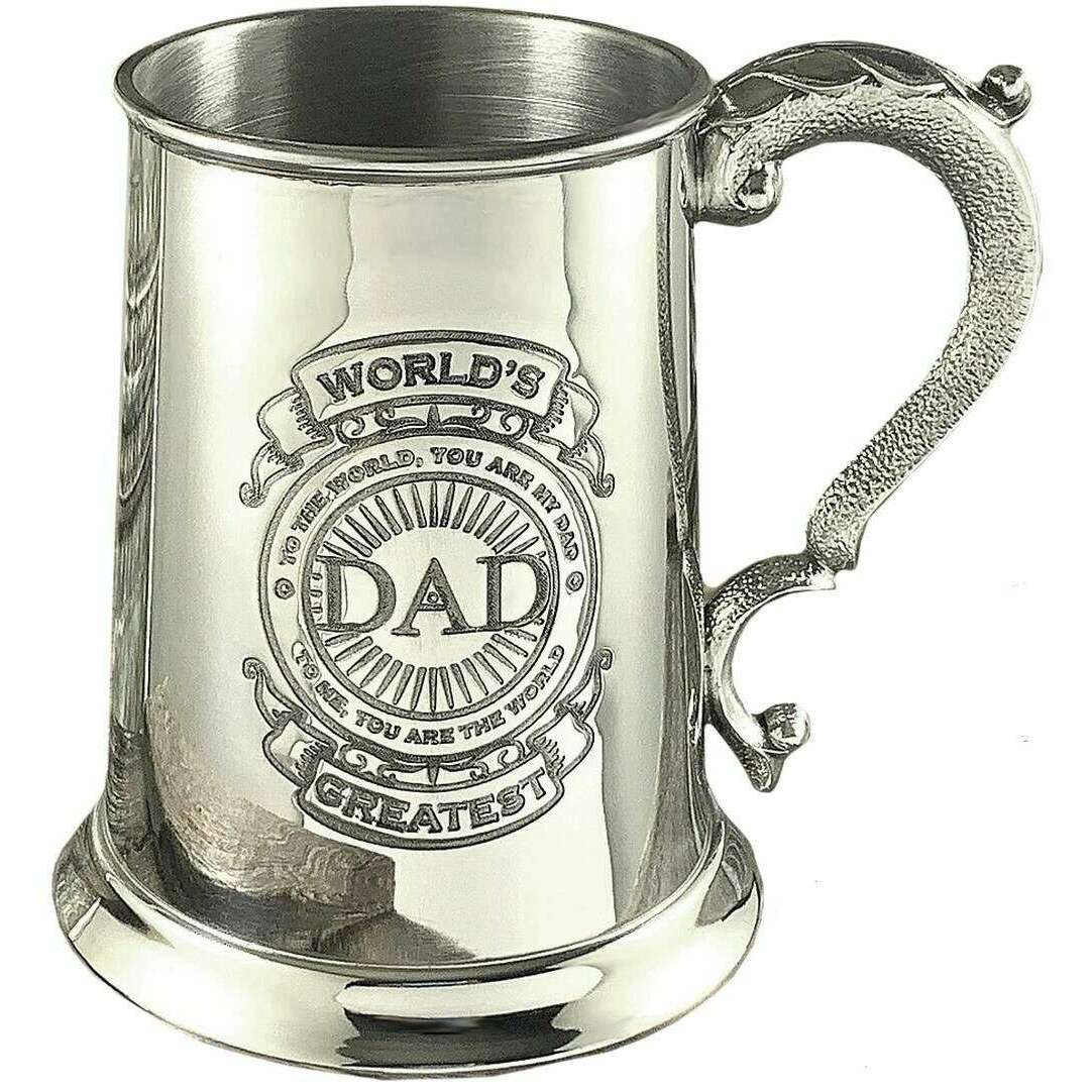 Brought to you by the brand English Pewter Company, this silver unisex 1pt world's greatest dad tankard is made from pewter. It measures 12.75cm(height). All the drinkware and glassware comes complete in a english pewter company gift box. The English Pewter Company 1pt World's Greatest Dad Tankard - Silver will make the perfect gift for someone special or to add to your drinkware. It features a sturdy handle with an intricate design and offer classic appeal with its weighty finish. Fill it up with your favourite ale or craft beer and raise a toast for the special occasion. The high quality material ensures it gives off timeless charm.