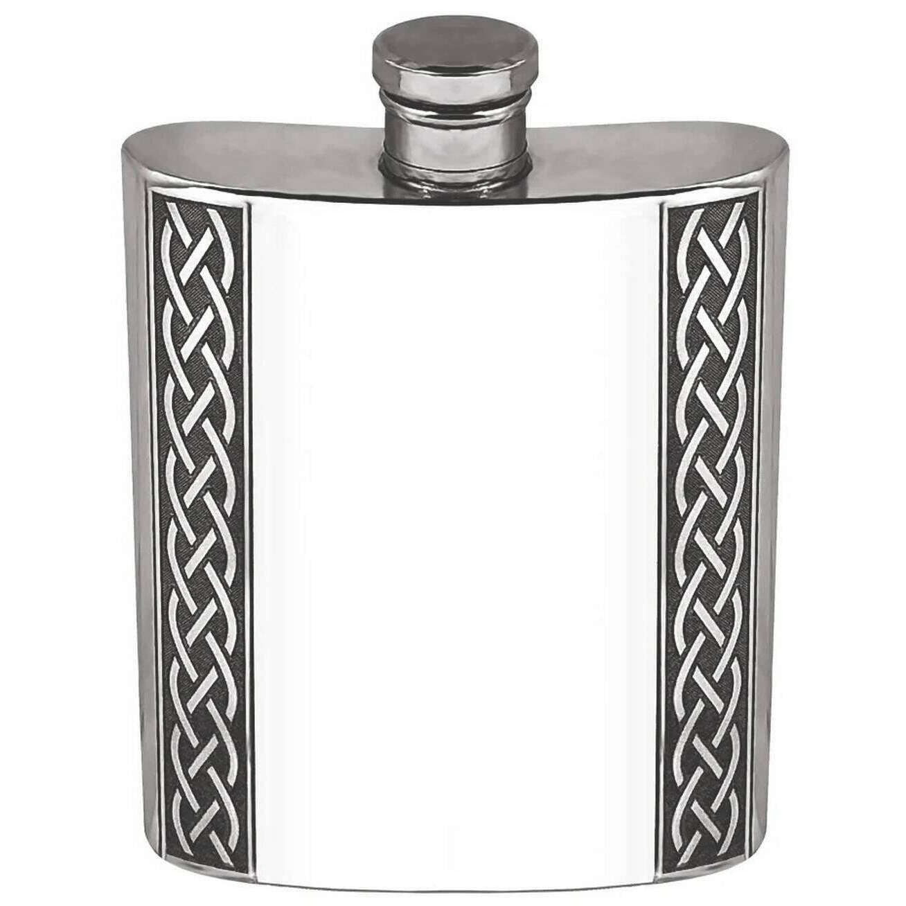 Perfect for men or women is this English Pewter Company silver 6oz embossed celtic band flask, it is also made from pewter. It measures 12cm(height). All the hip flasks come complete in a english pewter company gift box. The English Pewter Company 6oz Embossed Celtic Band Flask - Silver has been crafted to an exquisite standard, ensuring it doesn't tarnish over time, giving you a long-term companion. Perfect for storing your favourite drink and allowing you to sip it on the go, keeping it fresh so that every sip is just as good as the last. It features a stunningly intricate Celtic design engraved on the front making it a must have for your collection.