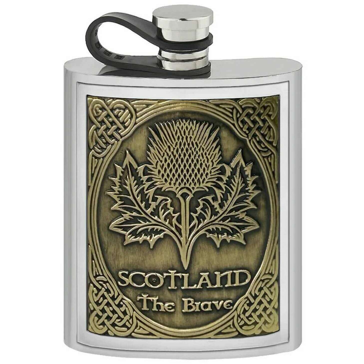 Using silver pewter and brass, this 6oz embossed thistle pewter flask by English Pewter Company is perfect for men or women and a must have. It measures 12cm(height). English Pewter Company have made this 6oz embossed thistle pewter flask in Britain. All the hip flasks come complete with english pewter company packaging. The English Pewter Company 6oz Embossed Thistle Pewter Flask - Silver/Brass Gold features a stylish leather captive top, adding subtle sophistication to the piece. Perfect for storing your favourite drink and allowing you to sip it on the go, keeping it fresh so that every sip is just as good as the last. It exhibits an intricate thistle design which is the Scottish national flower which represents resilience and beauty. This hip flask is lightweight and compact, ideal for sliding into your pocket for on the go sips.
