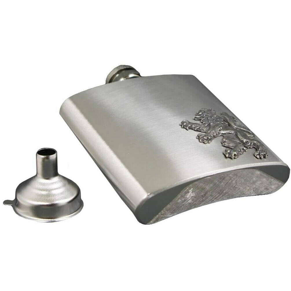 Using silver pewter, this 6oz rampant lion badge flask by English Pewter Company is perfect for men or women and a must have. It measures 11cm(height). All the hip flasks come complete in a english pewter company gift box. The English Pewter Company 6oz Rampant Lion Badge Flask - Silver features a simplistic design ensuring a sleek and stylish companion. Blending both elegance and practicality, this purse hip flask is the epitome of sophistication. The screw-cap ensures that your favourite beverage is secure inside with its leak-proof seal but also making sure it is easily accessible. Its timeless design and durable construction make it a wonderful gift for friends, family, or even yourself.