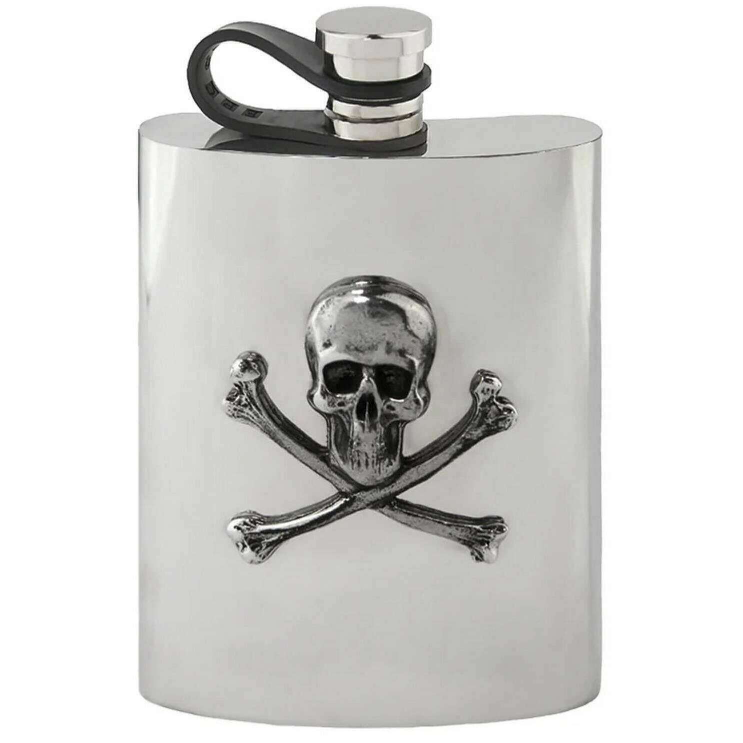 This unisex 6oz skull and crossbones flexi cap hip flask has been made from pewter, featured in a silver colour and is from the brand English Pewter Company. It measures 12cm(height). English Pewter Company have made this 6oz skull and crossbones flexi cap hip flask in Britain. All the hip flasks come complete with english pewter company packaging. The English Pewter Company 6oz Skull and Crossbones Flexi Cap Hip Flask - Silver will make the perfect companion, storing your favourite beverage in timeless style and impeccable quality. The flexi-cap ensures that your favourite drink is secure inside with its leak-proof seal but also making sure it is easily accessible. Adorned with a classic design, this hip flask would make the perfect gift.