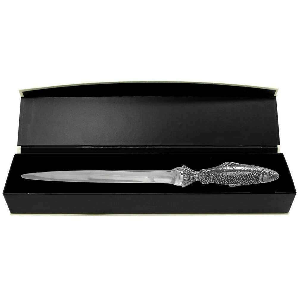 Introducing this unisex fish handle letter opener by English Pewter Company, it is manufactured from pewter in a silver colour. It measures 21.5cm(height). English Pewter Company have made this fish handle letter opener in Britain. All the desk accessories come complete with english pewter company packaging. The English Pewter Company Fish Handle Letter Opener - Silver is a truly flawless design with a fish as the handle that looks great, making it a perfect gift for those fishing lovers. Will sit beautifully on your desk at home or work, or simply to be displayed to show off its full beauty. Also made to last due to it being made from the best of materials that does not tarnish over time.