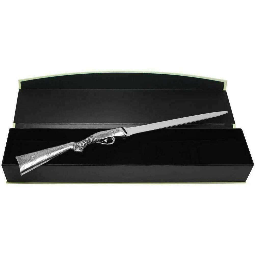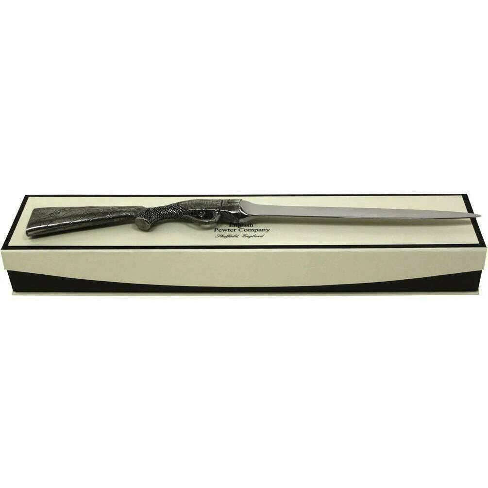 Brought to you by the brand English Pewter Company, this silver unisex shotgun handle letter opener is made from pewter and stainless steel. It measures 25cm(height). English Pewter Company have made this shotgun handle letter opener in Britain. All the desk accessories come complete with english pewter company packaging. The English Pewter Company Shotgun Handle Letter Opener - Silver has been made with detail in mind. This opener is truly stunning with its shotgun handle and the blade looking like the rest of the gun. Remaining tarnish free, this is made from the best of materials so you can give this as a gift to that country gentleman as it is certain to impress.