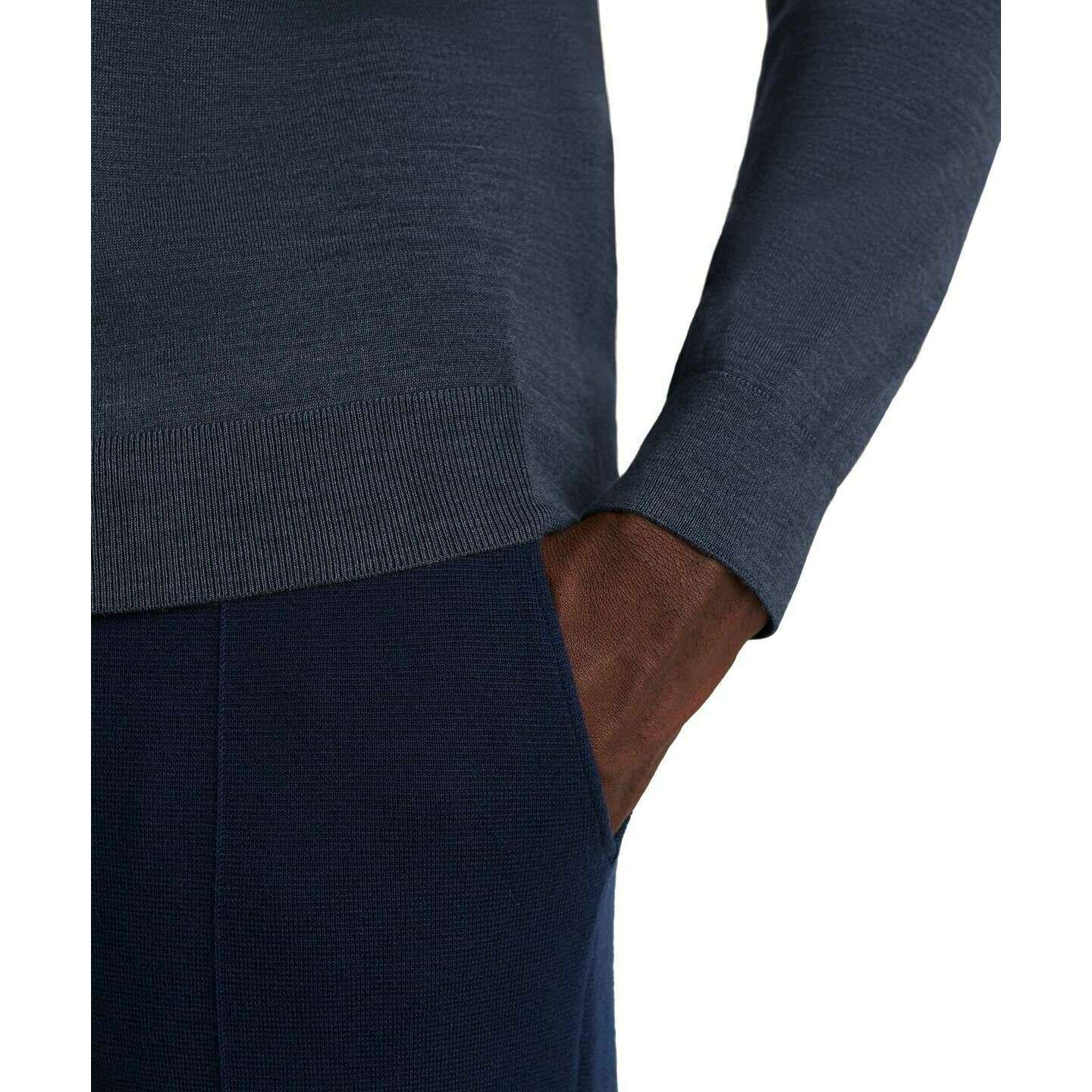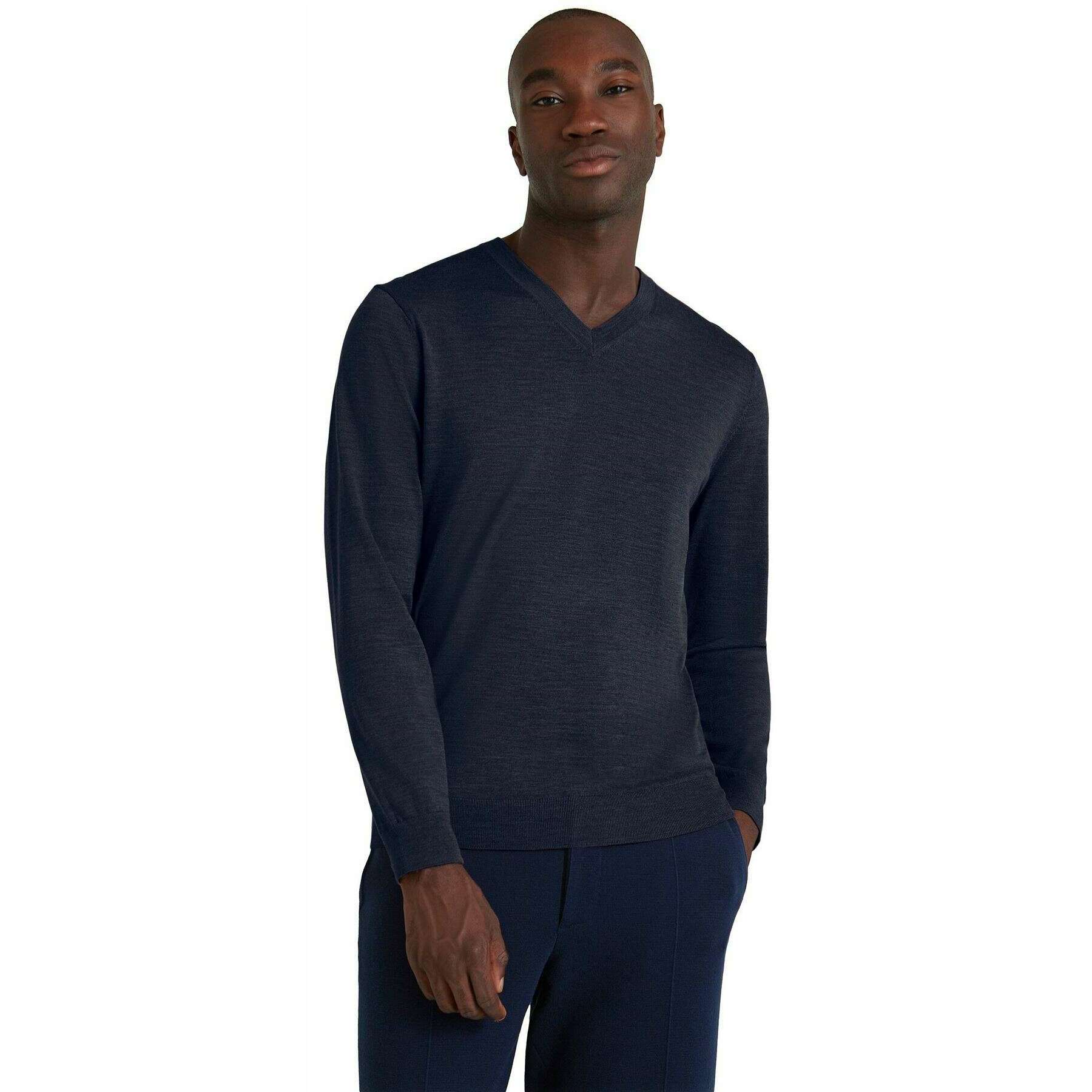 Brought to you by the brand Falke, this space blue men's merino ultra-fine v-neck sweater is made from 98% virgin wool and 2% elastane. Also the space blue jumper is designed in a plain pattern, It is recommended to machine wash at 30 degrees to keep this jumper in good condition. All the jumpers come complete with falke packaging. The Falke Merino Ultra-Fine V-Neck Sweater - Space Blue is a must-have piece to elevate your winter wardrobe with the classic design to give that traditional touch. Crafted from mulesing-free merino wool gives a light wear perfect for mild to cold outdoor temperatures keeping you warm in the autumn and winter. Giving this sweater its fashionable look is the French shoulder seams, fine ribbed neckline and elasticated ribbed cuffs on the trunk and sleeves. The high-quality 'fully fashioned' processing gives an exclusive feel that will be enjoyed and will stay this way for many years to come.