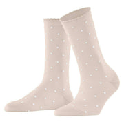 These well made women's spike dot socks from Falke come in a cream colour and are manufactured from 85% cotton, 10% polyamide, 4% rayon and 1% elastane. Also the cream socks are designed in a spots pattern, It is recommended to wash at 30 degrees to keep these socks in good condition. All the socks come complete with falke tags. The Falke Spike Dot Socks - Cream combine a feminine dot design with the skin-friendly comfort of FALKE WE CARE COTTON. Their fine, contrasting dots create a timeless and elegant look, making them a versatile accessory that complements both casual and chic outfits. The slightly ruffled cuff enhances their feminine appeal, while the smooth knitted background provides a refined finish. Made from sustainable, mercerised organic cotton, they reflect FALKE s commitment to resource saving, socially responsible, and traceable materials. Reinforced stress zones ensure lasting durability, and the signature FALKE Perfect Fit guarantees exceptional comfort throughout the day. Bringing together sustainable cotton comfort and fashionable design, these socks offer a stylish and responsible choice for everyday wear.