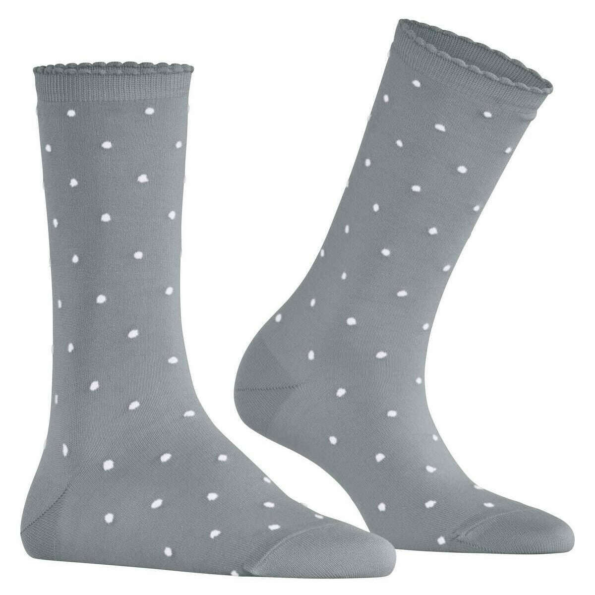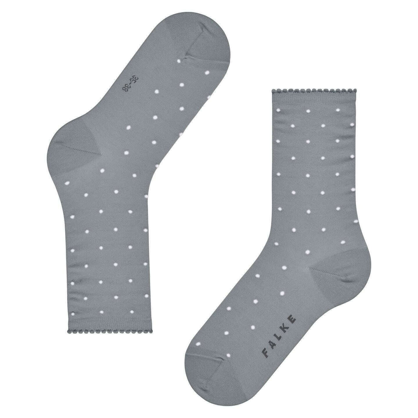 Introducing these women's spike dot socks by Falke, they are manufactured from 85% cotton, 10% polyamide, 4% rayon and 1% elastane in a silver colour. Also the silver socks are designed in a spots pattern, It is recommended to wash at 30 degrees to keep these socks in good condition. All the socks come complete with falke tags. The Falke Spike Dot Socks - Silver combine a feminine dot design with the skin-friendly comfort of FALKE WE CARE COTTON. Their fine, contrasting dots create a timeless and elegant look, making them a versatile accessory that complements both casual and chic outfits. The slightly ruffled cuff enhances their feminine appeal, while the smooth knitted background provides a refined finish. Made from sustainable, mercerised organic cotton, they reflect FALKE s commitment to resource saving, socially responsible, and traceable materials. Reinforced stress zones ensure lasting durability, and the signature FALKE Perfect Fit guarantees exceptional comfort throughout the day. Bringing together sustainable cotton comfort and fashionable design, these socks offer a stylish and responsible choice for everyday wear.