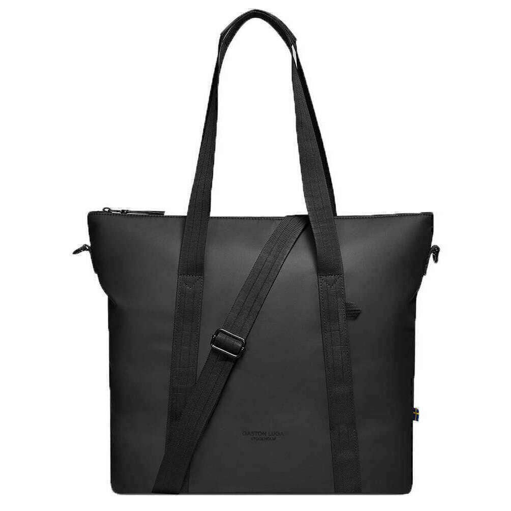 This unisex dash shopper shoulder bag by the brand Gaston Luga is made from 71% recycled polyester with polyurethane coating and 29% recycled polyester lining and is showcased in black. It measures 36cm(height) x 36cm(width) x 10.5cm(depth). It is recommended to use a simple damp cloth to keep this bag in good condition. All the bags come complete with gaston luga tags. The Gaston Luga Dash Shopper Shoulder Bag - Black is a versatile and stylish accessory designed for practicality and fashion forward individuals. Crafted with a blend of functionality and contemporary aesthetics, this shoulder bag caters to various needs from daily commuting to casual outings. Featuring a spacious main compartment with an inner mesh pocket, this bag accommodates all your essentials ensuring easy access and organization on the go. The adjustable shoulder strap allows for comfortable wear over the shoulder or across the body. This bag complements your personal style while maintaining a practical edge.
