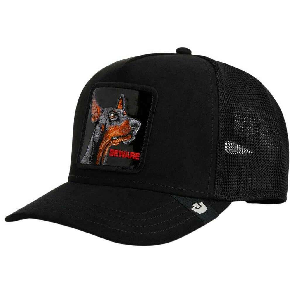 Manufactured from 84% polyester and 16% cotton is this void black unisex black out doberman trucker hat by the designer Goorin Bros. All the hats come complete with goorin bros tags. The Goorin Bros Black Out Doberman Trucker Hat - Void Black embodies strength, awareness, and an uncompromising presence. Part of the exclusive Black Out series, it features a deep all?black aesthetic that gains striking contrast through its bold Doberman patch. The metallic?shimmering patch, paired with the distinctive Beware lettering, delivers a fierce and captivating look, making the cap an unmistakable statement piece. Its soft suede front panel adds a premium tactile feel while maintaining durable structure. Combined with a breathable mesh back and an adjustable snapback closure, it ensures a perfect balance of comfort and style. Designed for those who want to express confidence with a touch of danger, this cap delivers exactly that assertive, sleek, and impossible to overlook.