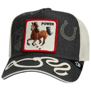 This unisex full throttle trucker hat by the brand Goorin Bros is made from 57% polyester and 43% cotton and is showcased in navy. All the hats come complete with goorin bros tags. The Goorin Bros Full Throttle Trucker Hat - Navy Blue is a tribute to pure, unrestrained freedom. Its dynamic horse patch immediately draws the eye, capturing the force and momentum of a mustang that cannot be tamed. The rugged denim front panel pairs perfectly with cream?coloured mesh, creating a look that s both bold and authentically Western. Casual lasso embroidery on the visor adds a unique touch of craftsmanship, while subtle horseshoe prints reinforce the cap s tribute to strength, grit, and unstoppable drive. With an adjustable snapback, it ensures a perfect fit for every adventure. For those who don t just feel their power but proudly wear it this cap stands out from the crowd in every way. A true statement for free spirits and modern riders.