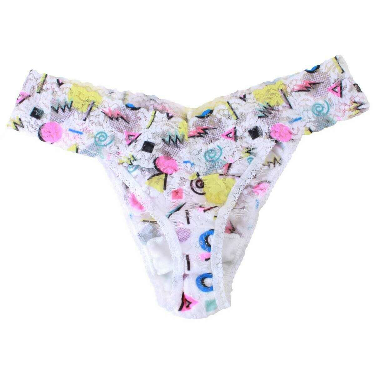 This women's 80s rad geo original rise thong by the brand Hanky Panky is made from 100% nylon body, 90% nylon, 10% spandex trim and 100% supima cotton crotch lining and is showcased in white. Hanky Panky have made this 80s rad geo original rise thong in USA. It is recommended to hand wash in cool water with mild detergent and dry flat to keep this underwear in good condition. All the underwear comes complete with hanky panky packaging. The Hanky Panky 80s Rad Geo Original Rise Thong - White/Multi are certain to impress with their super comfortable fit and feminine design. These thongs have been flawlessly crafted with a design that sits higher on the hips and will give you no visible panty line when wearing for any occasion. Their V-front and V-back waistband will keep these looking stylish on you all year round. Make these the most ideal new underwear you can buy.
