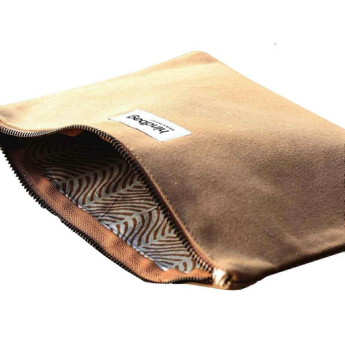 Perfect for men or women is this Hindbag cinnamon brown ema medium zipped pouch, it is also made from 100% organic cotton. It measures 18cm(height) x 25cm(width). All the bags come complete with hindbag packaging. The Hindbag Ema Medium Zipped Pouch - Cinnamon Brown is a modern, minimalistic and functional accessory designed for storing all your essential items, such as cards, cash and small personal belongings. This eco-friendly zipped pouch features a super strong YKK zipper and thick cotton to withstand all the hazards of everyday life. The handmade patterned lining adds a touch of elegance to this piece.