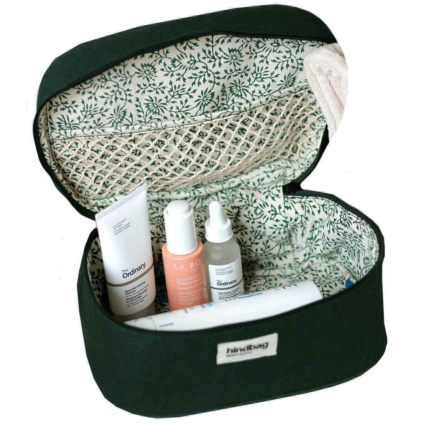 Designer Hindbag has brought you this unisex 100% organic cotton bag using forest green tones. It measures 13.5cm(height) x 16cm(width) x 25cm(depth). All the bags come complete with hindbag packaging. The Hindbag Gaspard Vanity Bag - Forest Green offers travellers and everyday users alike a convenient and stylish way to keep their toiletries organized and accessible. The interior net is perfect for neatly arranging toiletries, cosmetics, and other personal items. Available in a range of colours, this fashionable accessory represents a harmonious fusion of functionality and aesthetics, catering to those who value both style and practicality in their journey.