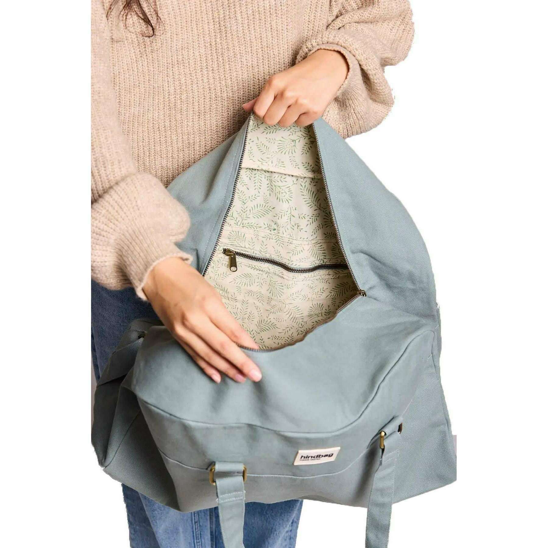 This well made unisex yves large travel bag from Hindbag comes in a sage blue colour and is manufactured from 100% organic cotton. It measures 33cm(height) x 54cm(width) x 24cm(depth). All the bags come complete with hindbag packaging. The Hindbag Yves Large Travel Bag - Sage Blue is a spacious and eco-friendly option for travellers. Crafted from thick, GOTS-certified organic cotton, this bag features multiple pockets for organization, a secure zipper closure, and a printed inner lining that adds a touch of elegance. With its handles and large adjustable shoulder strap, this bag can be easily carried by hand or on the shoulder.