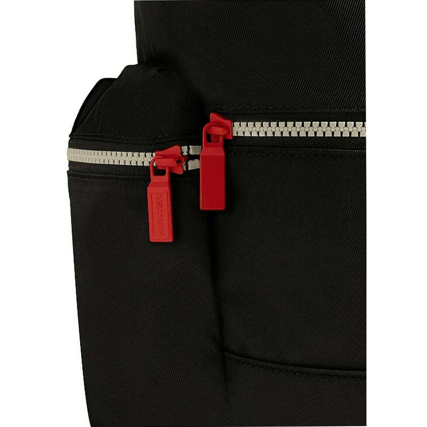 This unisex nylon mini topclip backpack has been made from 100% nylon , featured in a black colour and is from the brand Hunter. It measures 32cm(height) x 23.5cm(width) x 11.5cm(depth). All the bags come complete with hunter packaging. The Hunter Nylon Mini Topclip Backpack - Black features a zipper and buckle closure to ensure a secure wear. This bag has been crafted with fully water-resistant materials to ensure a dry wear in any weathers or accidents. The 13L capacity allows space for all your essentials with the convenient zipper side pockets, internal zipper pocket, and the front zipper pocket. The padded adjustable straps give optimal comfort whilst on your adventures. Completing this sleek and classic look is the Hunter branding on the front and the red zips.