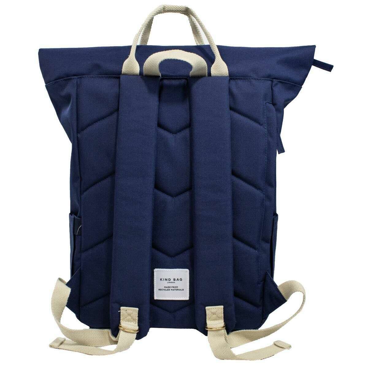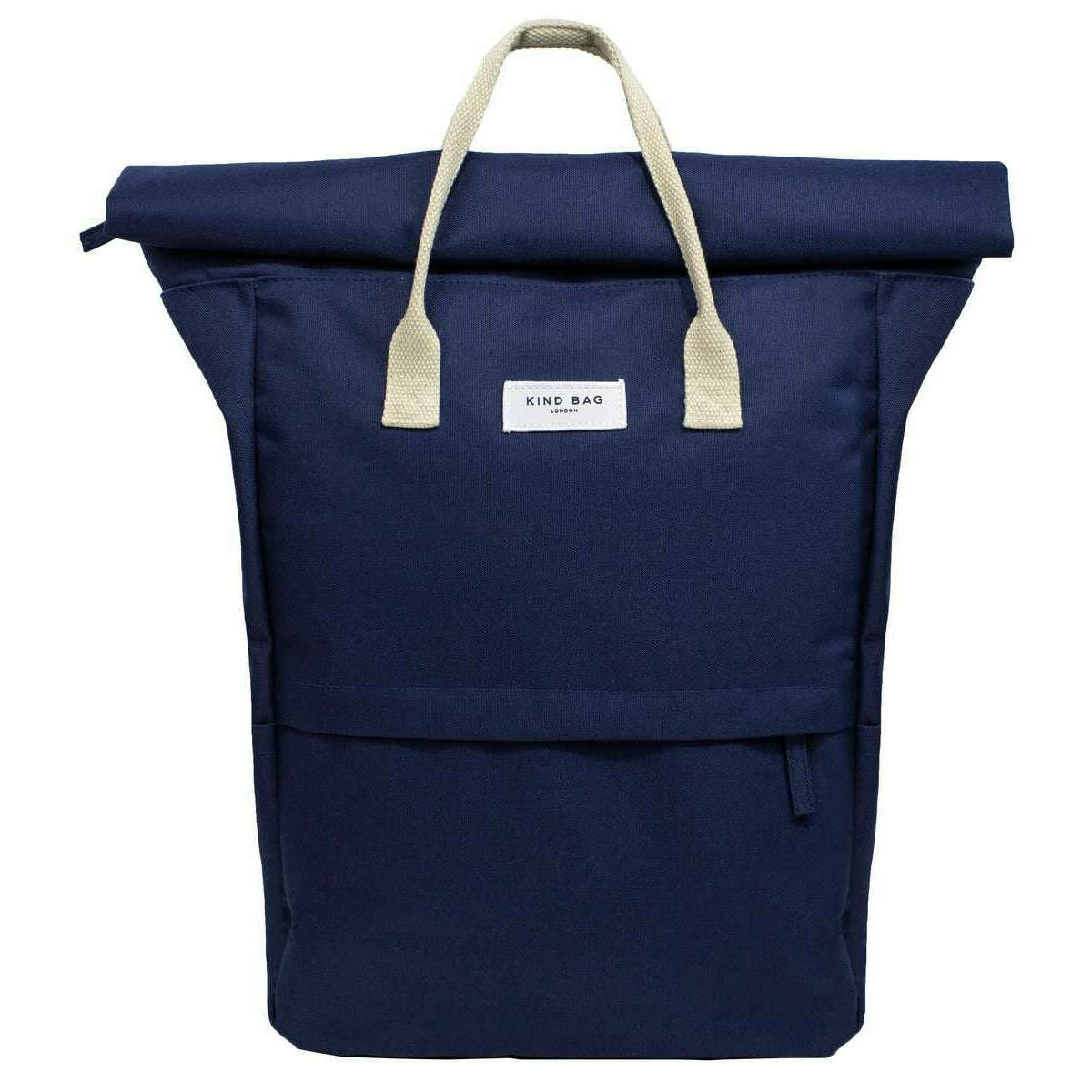 Using navy 100% recycled plastic, this hackney large backpack by Kind Bag London is perfect for men or women and a must have. It measures 38cm(height) x 30cm(width) x 14cm(depth). All the bags come complete with kind bag london packaging. The Kind Bag London Hackney Large Backpack - Navy is a high-quality cruelty free and vegan bag crafted from recycled plastic bottles and water-resistant fabric. This bag has lots of features that makes it the perfect fit for anyone such as hidden magnets within the handle straps to keep them together, a 12 centimetre roll top for an extendable capacity, an anti-theft pocket between the back padding and main compartment, padded back and shoulder straps for a comfortable wear, two hooks to hold keys, 2 side pockets for water bottles or umbrellas, front zipped pocket, padded laptop pocket fitting most 16" models, 2 small pockets and small zipped interior pocket. All of these features combined create the ideal backpack for your everyday adventures or travelling whilst the cute design will compliment any outfit.