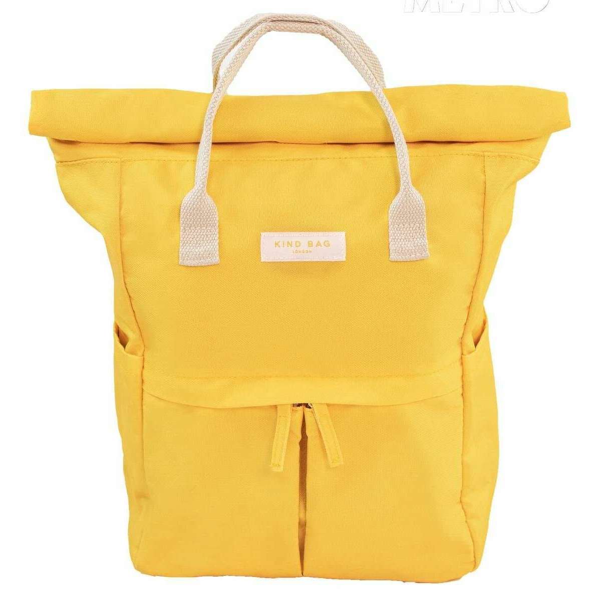 This unisex hackney medium backpack by the brand Kind Bag London is made from 100% recycled plastic and is showcased in yellow. It measures 33cm(height) x 25.5cm(width) x 12.5cm(depth). All the bags come complete with kind bag london packaging. The Kind Bag London Hackney Medium Backpack - Tuscan Sun Yellow is a high-quality cruelty free and vegan bag crafted from recycled plastic bottles and water-resistant fabric. This bag has lots of features that makes it the perfect fit for anyone such as hidden magnets within the handle straps to keep them together, a 12 centimetre roll top for an extendable capacity, an anti-theft pocket between the back padding and main compartment, padded back and shoulder straps for a comfortable wear, two hooks to hold keys, 2 side pockets for water bottles or umbrellas, front zipped pocket, padded laptop pocket fitting most 13" models, 2 small pockets and small zipped interior pocket. All of these features combined create the ideal backpack for your everyday adventures or travelling whilst the cute design will compliment any outfit.
