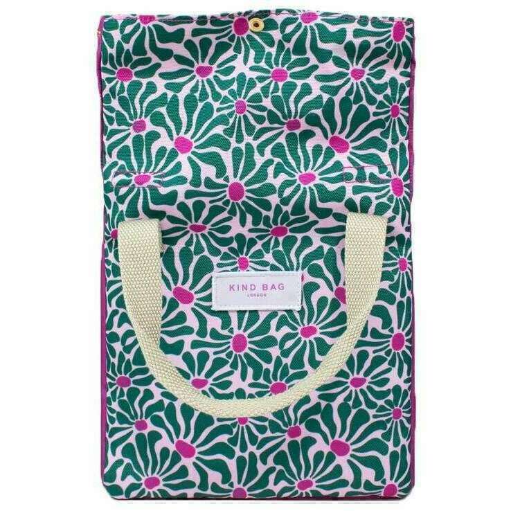 This lunch bag for women is fashioned by the brand Kind Bag London in a green colour and is made from 100% recycled plastic. It measures 33cm(height) x 22cm(width) x 14cm(depth). It is recommended to machine wash at 30degrees on a delicate setting and do not tumble dry to keep this bag in good condition. All the bags come complete with kind bag packaging. The Kind Bag London Lunch Bag - Abstract Flowers Green/Purple made from recycled materials is perfect for taking to work, school or for a picnic to create a more fun and enjoyable snack time. The magnetic roll top with button closures creates a secure closure and wide opening for easy access, the interior pockets are great for organising your snacks and cutlery and the button fastened handles are great for convenience when transporting. This lunch bag is BPA free and has no PFA coatings.
