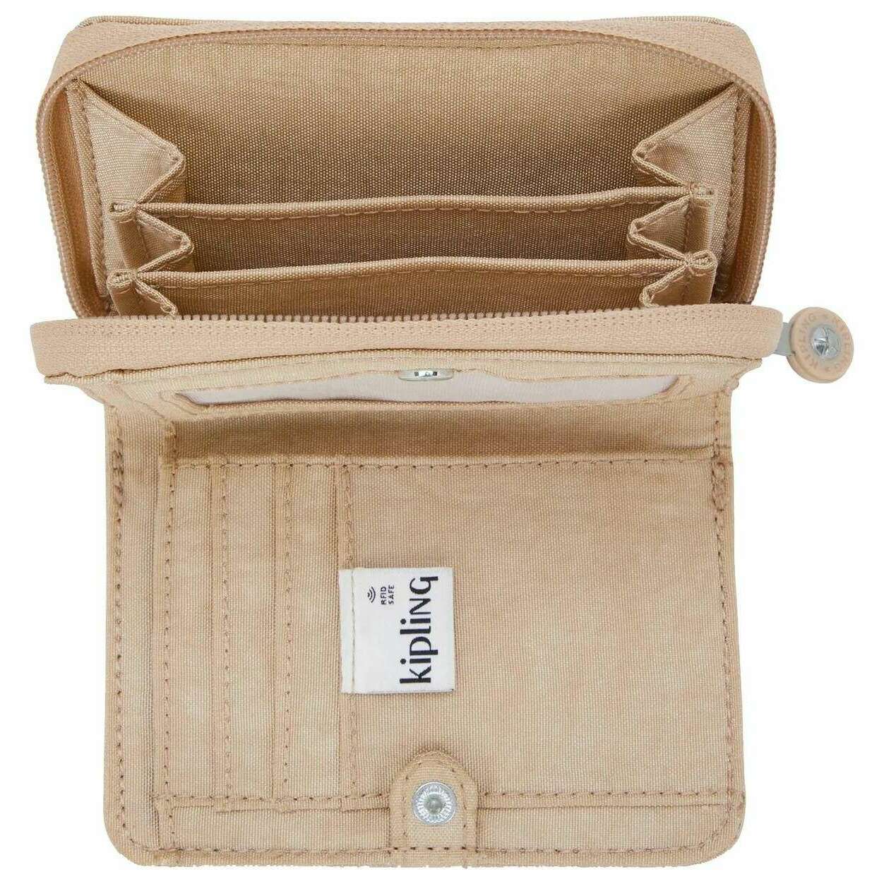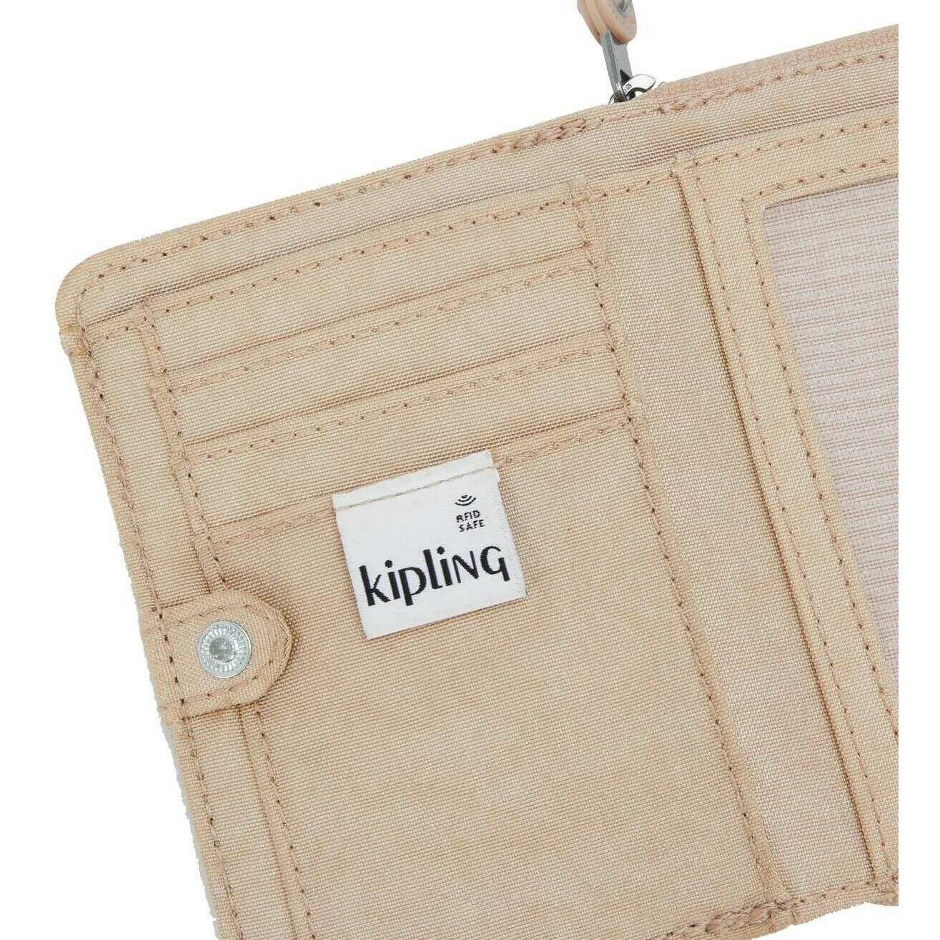 This women's money love purse by the brand Kipling is made from 60% polyamide and 40% recycled polyamide and is showcased in beige. It measures 12.5cm(height) x 9.5cm(width) x 2.5cm(depth). All the purses come complete with kipling packaging. The Kipling Money Love Purse - Sparkled Beige has innovative pockets and an easy zip closure for a simple yet classic design! This wallet includes RFID protection, which helps guard against wireless skimming of credit card data. Great for carrying cash, cards, and ID, this wallet is compact but organized and is a good balance between capacity and portability, suited for those who do not like bulky wallets.