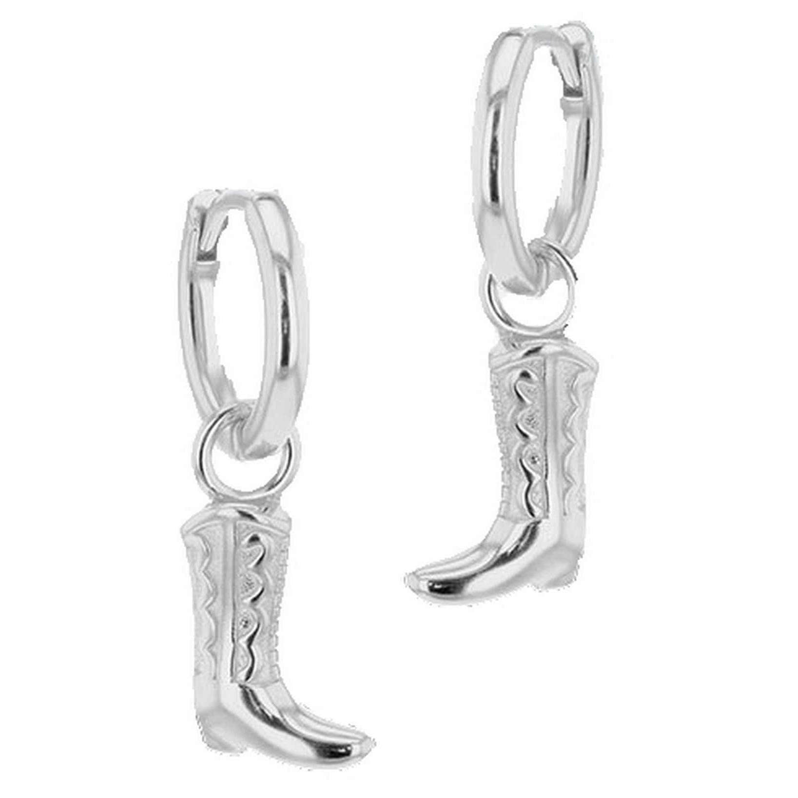 Manufactured from sterling silver are these silver women's cowboy boot hoop earrings by the designer KJ Beckett. All the earrings come complete with packaging. The KJ Beckett Cowboy Boot Hoop Earrings - Silver is a step up in your style! These western-inspired sterling silver hoop earrings feature a detailed cowboy boot charm, crafted from sterling silver and finished with sleek rhodium plating for lasting shine and tarnish resistance. Lightweight and comfortable, these earrings are perfect for everyday wear or adding a playful western touch to your outfit and make the perfect gift for cowgirl enthusiasts or anyone who loves unique, statement jewellery.