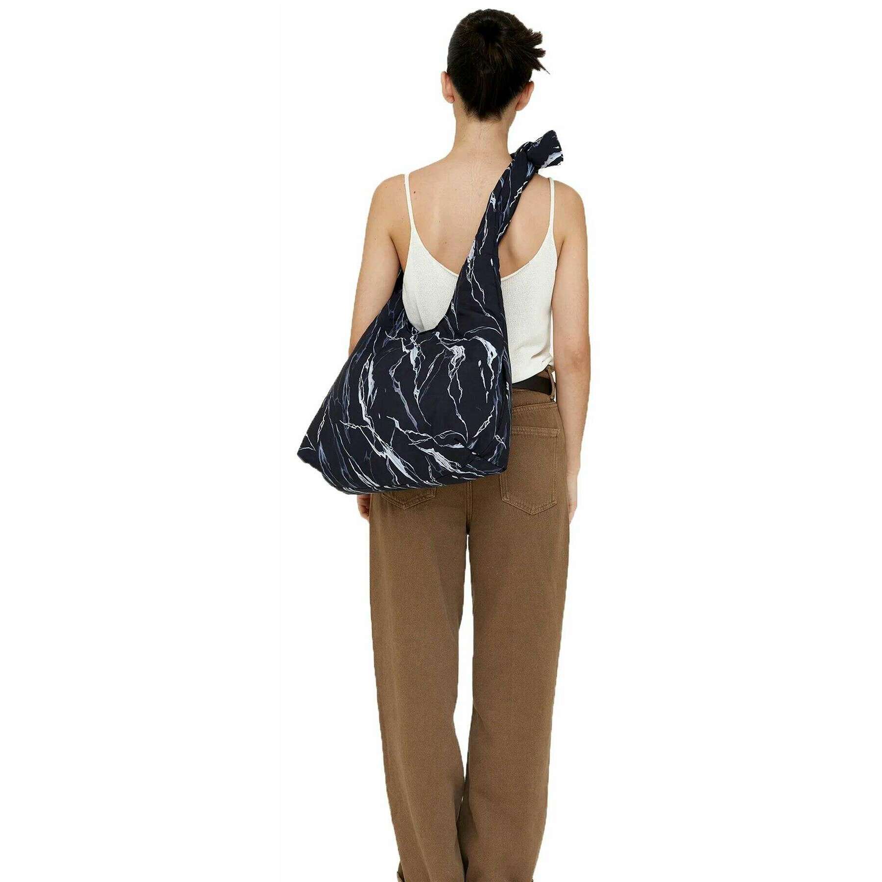 This women's mercedes bellido biwa puffy shoulder bag by the brand Lefrik is made from 100% recycled polyester and is showcased in black. It measures 35cm(height) x 46cm(width) x 14cm(depth). It is recommended to cold wash and air dry to keep this bag in good condition. All the bags come complete with lefrik packaging. The Lefrik Mercedes Bellido Biwa Puffy Shoulder Bag - Rock Print Black is a stylish and versatile shoulder bag that combines functionality with a delightful design. With a capacity of approximately 22.5 litres, this bag can be used both as a shoulder bag and as a messenger bag thanks to its adjustable sliding knots. Lightweight and water resistant, this vegan bag features a large main compartment and a zipped pocket for small items, secured by a magnetic closure. The print in this bag is a limited edition from the work of the Spanish artist and painter Mercedes Bellido, known for her enchanting and nature-inspired illustrations. Quilted and pleasant to the touch, this bag makes a great gift idea.