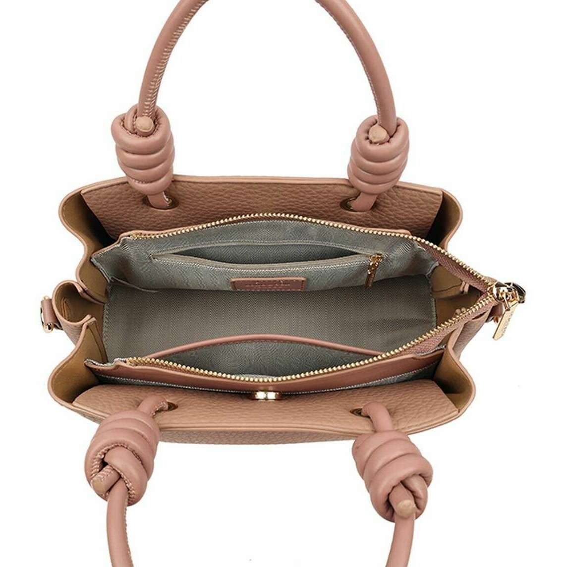 This knot crossbody bag for women is fashioned by the brand Long and Son in a pink colour and is made from 100% polyurethane. It measures 20cm(height) x 28cm(width) x 13cm(depth). All the bags come complete with long & son packaging. The Long and Son Knot Crossbody Bag - Pink features a large interior with an open and zipper pocket, extra compartments either side of the zipper held together with magnetic closures for extra storage and feet studs for protection when placing down. This bag doubles up as cross body and a handbag with the two carry handles and detachable adjustable crossbody strap. Great for an everyday bag due to the versatility and optimal storage.