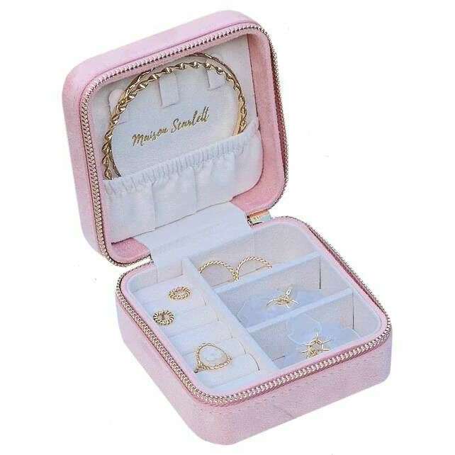 This corinne velvet travel jewellery box for women is fashioned by the brand Maison Scarlett in a pink colour and is made from 100% ultra-soft velvet. It measures 10cm(height) x 10cm(width) x 5.5cm(depth). All the jewellery boxes come complete with maison scarlett packaging. The Maison Scarlett Corinne Velvet Travel Jewellery Box - Pink will become your companion for life with its great organisation features and perfect size to slip into any bag whatever the occasion such as going on holiday, going to the gym, going for a sleepover, etc. Its ring roll holds up to six rings, four pairs of earrings with its separated compartments, three necklaces with the adjustable hooks and two bracelets with its elasticated pouch. The gold steel zipper closure engraved with Maison Scarlett offers security and elegance. Crafted with an ultra-soft velvet interior and exterior gives a chic and high-quality touch.